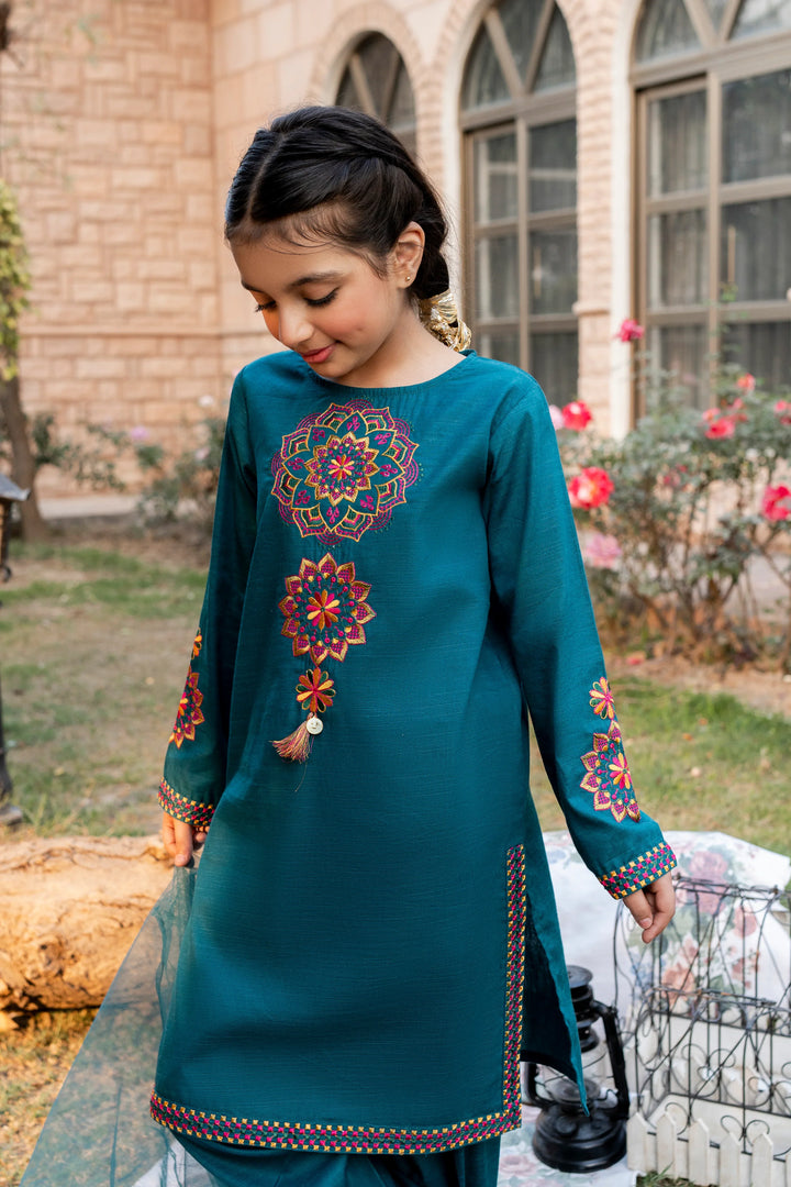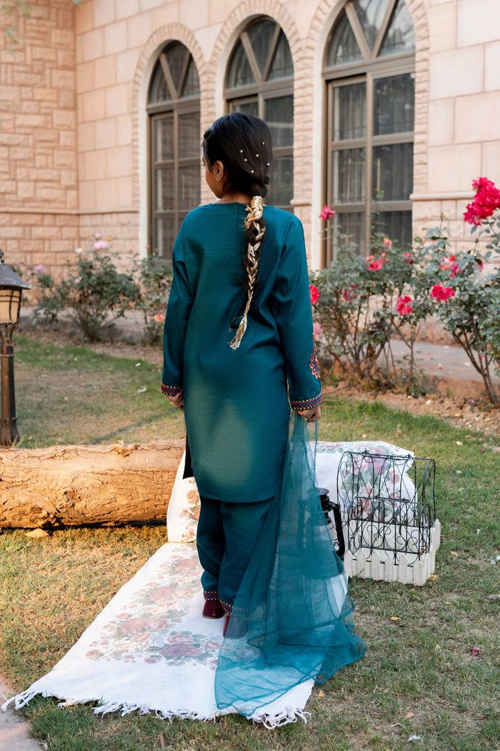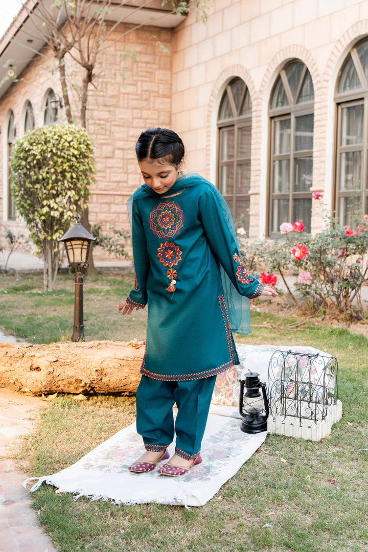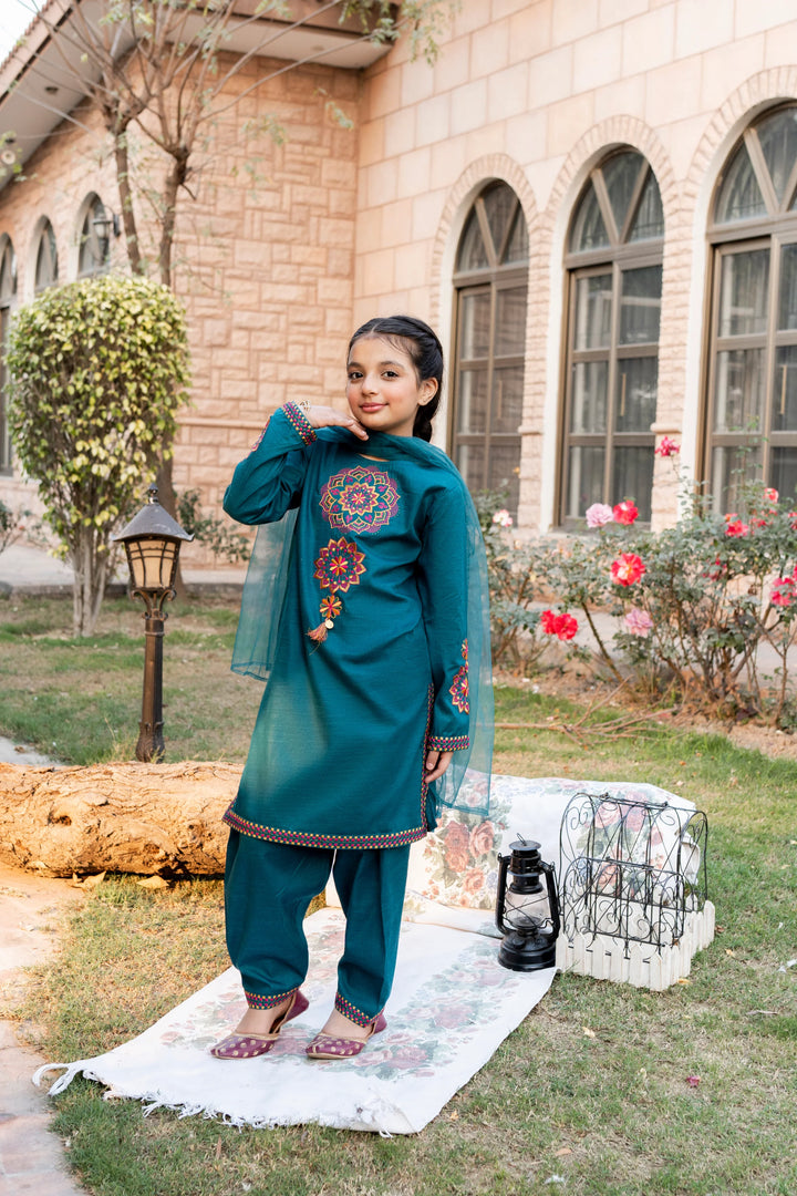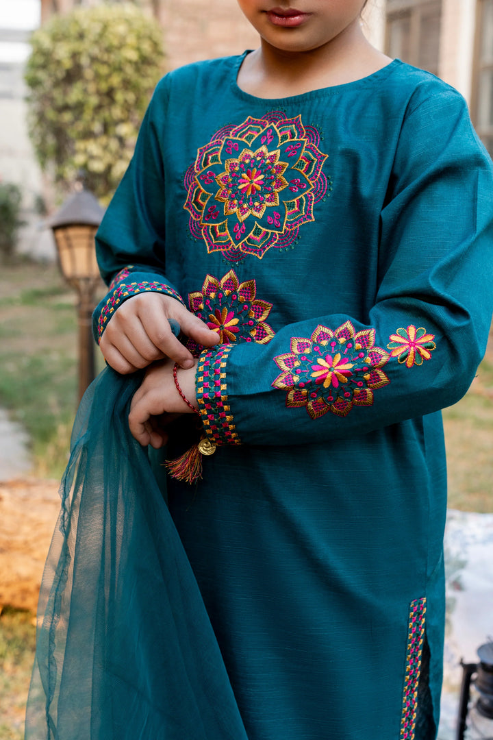 Al Qaswa - Girls Sea Green Embroidered Eid Outfit – 3-Piece Shirt, Trouser , and Dupatta Suit Set
