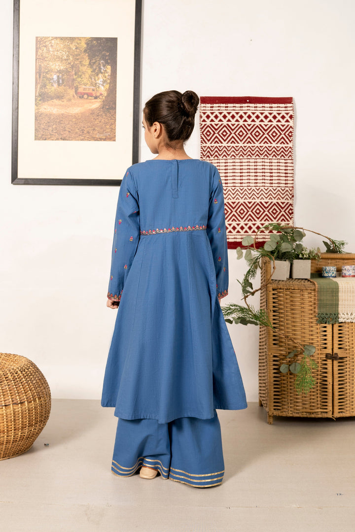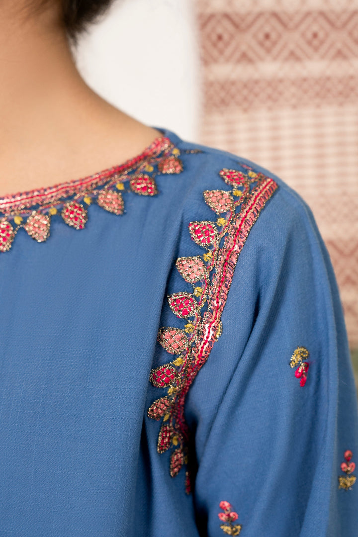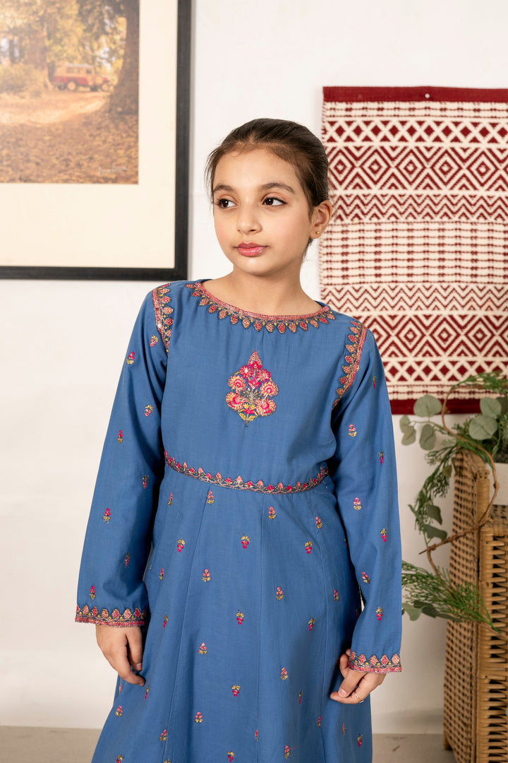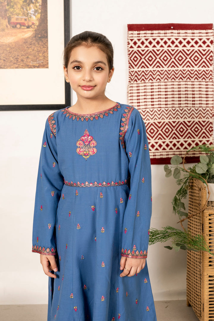 Al Qaswa - Girls Teal Blue Embroidered Outfit – 3-Piece Frock , Pants , and Dupatta Suit Set