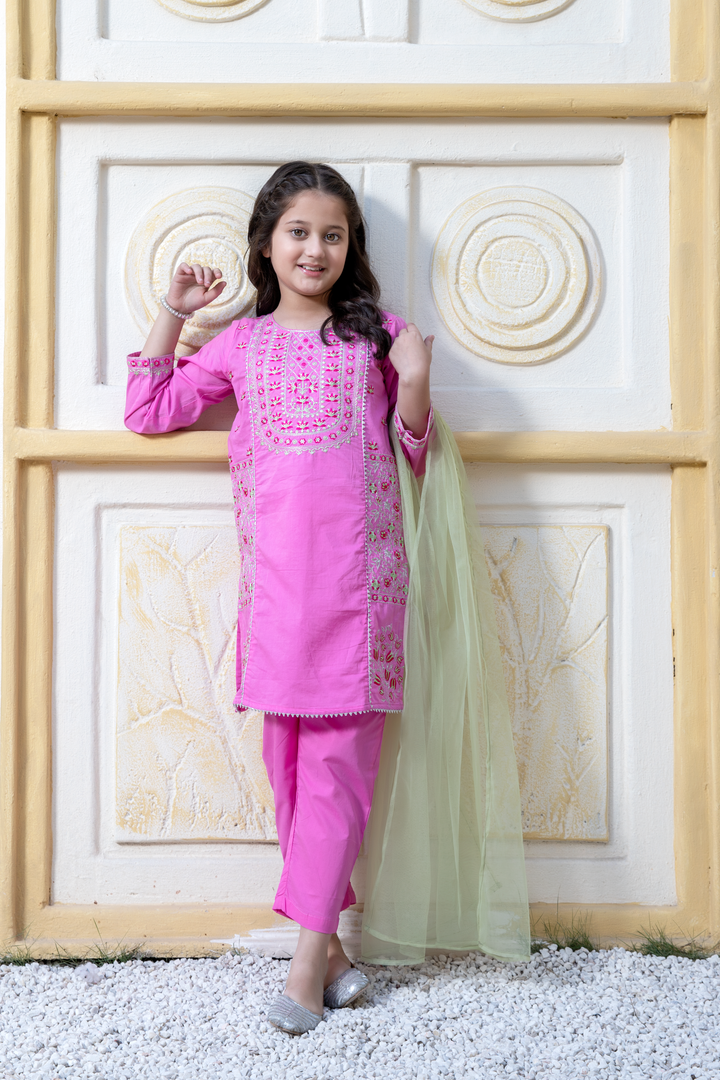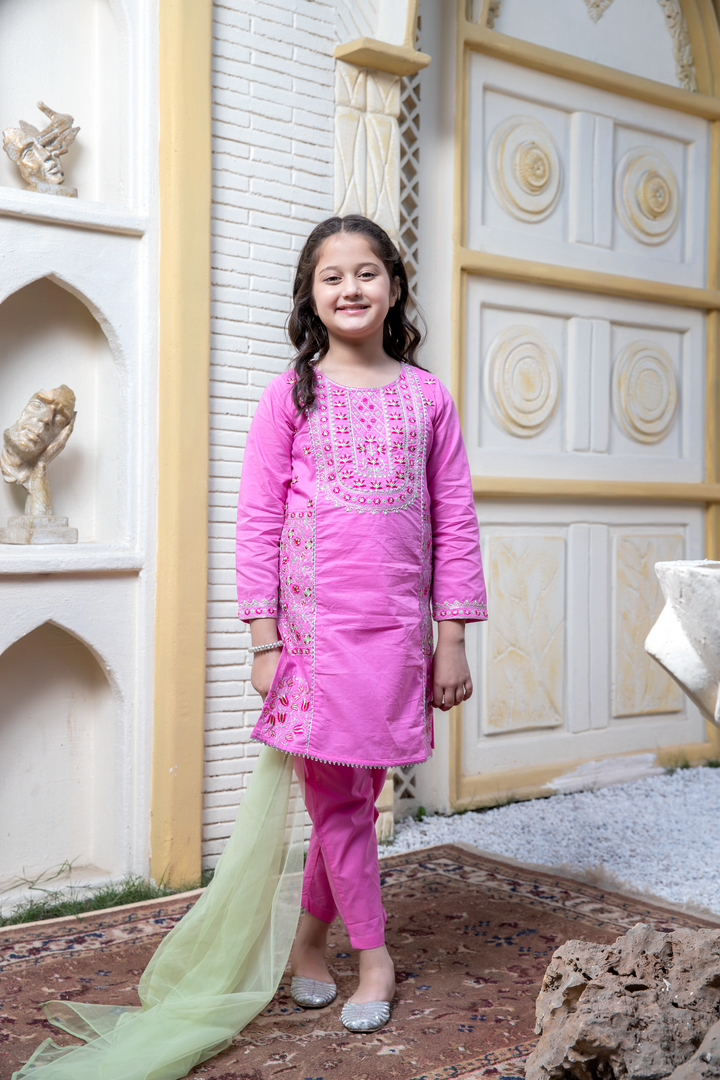 Al Qaswa - Girls Pink Embroidered Eid V-1 Outfit – 3-Piece Shirt, Trouser, and Dupatta Suit Set