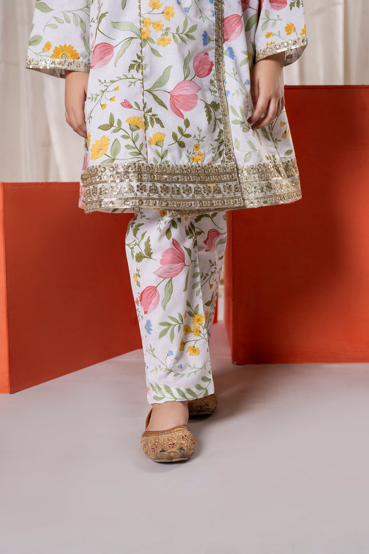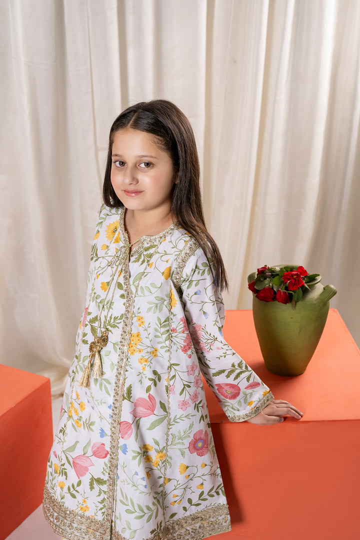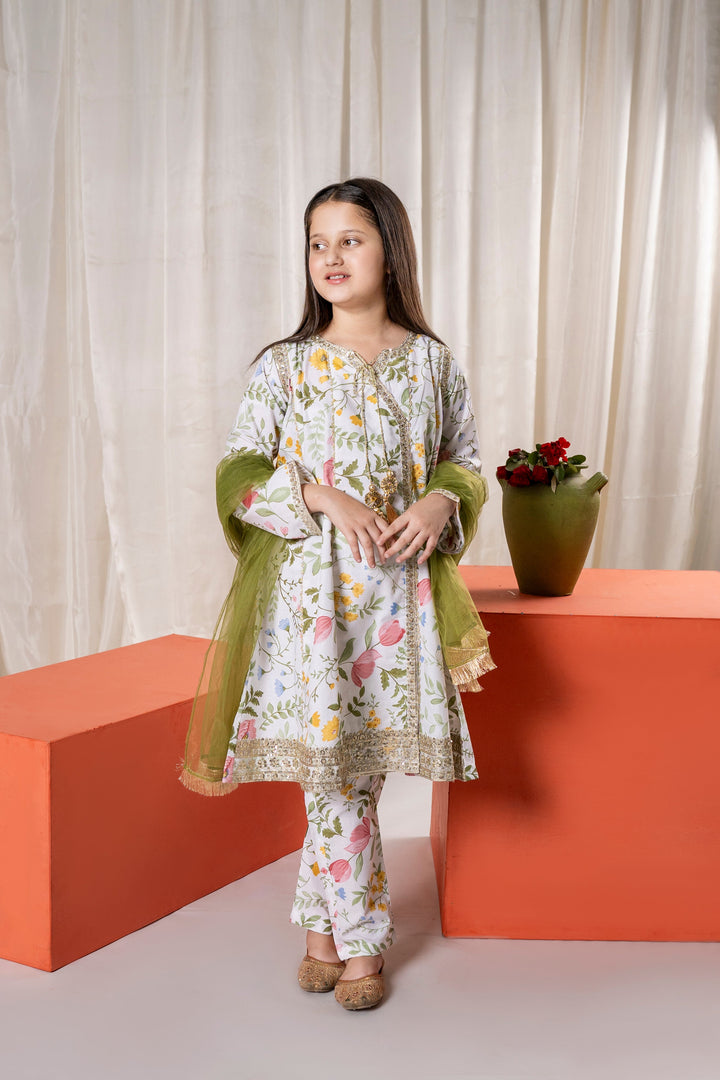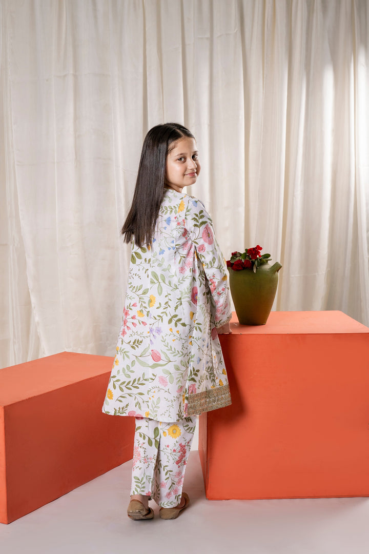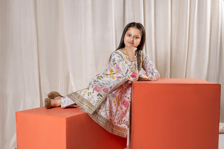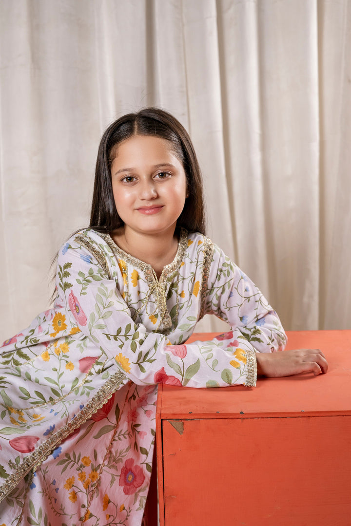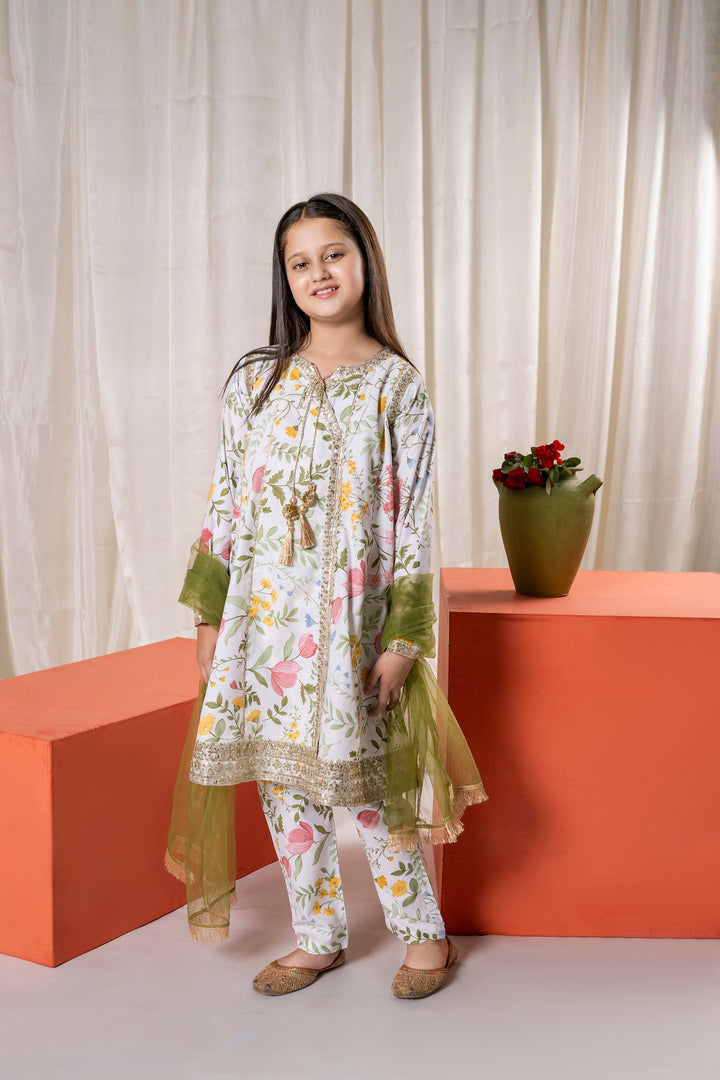 Al Qaswa - Girls White Embroidered Printed Floral Eid V-1 Outfit – 3-Piece Shirt, Trouser, and Dupatta Suit Set