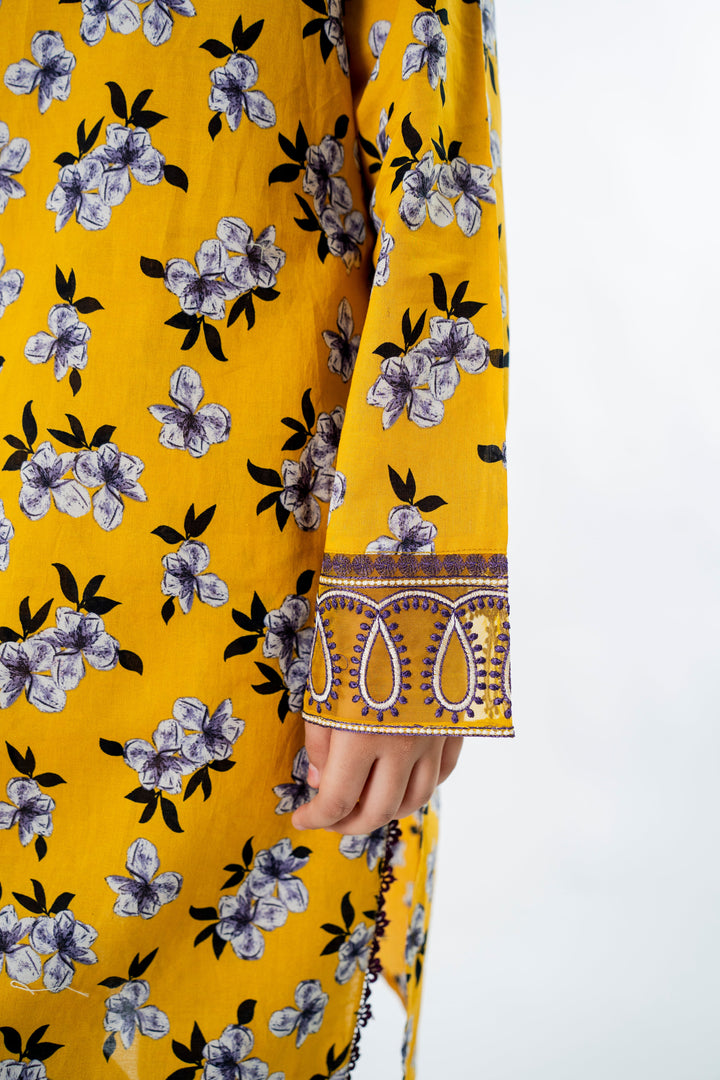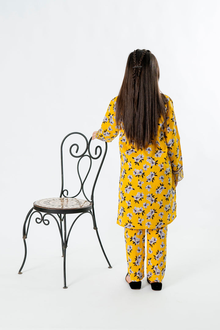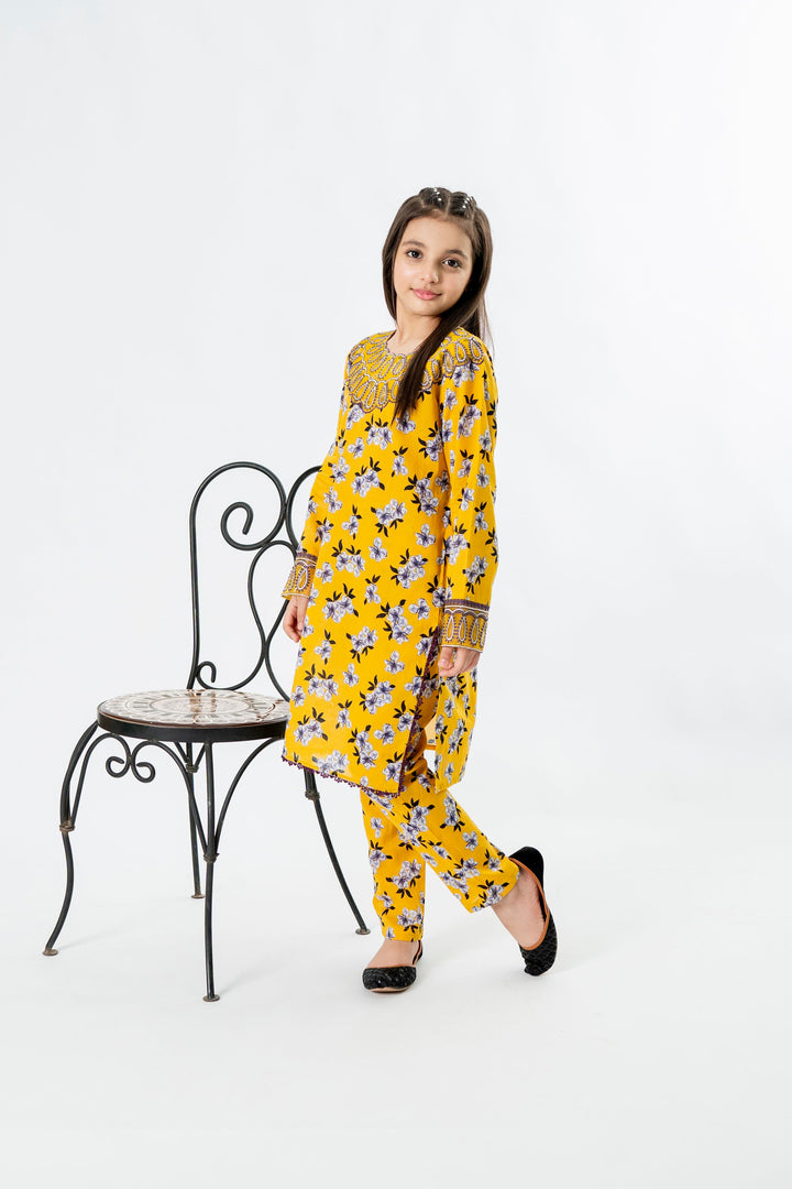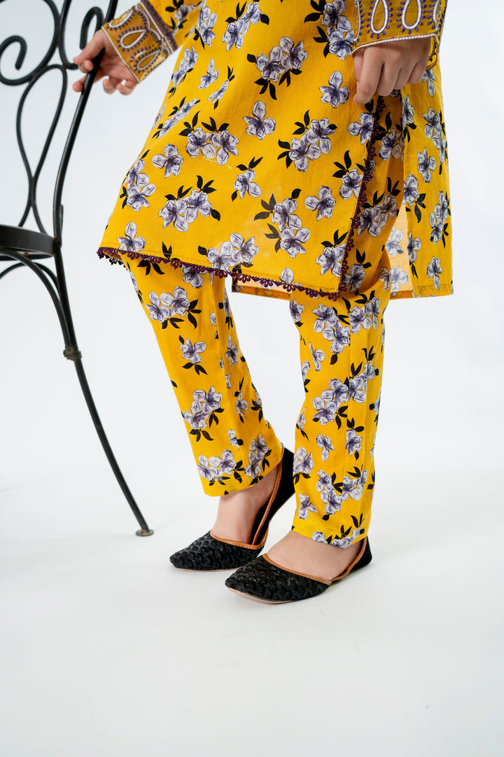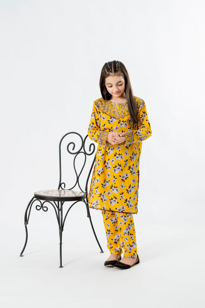 Al Qaswa - Girls Yellow Printed Embroidered Eid Outfit – 2-Piece Shirt & Trouser Coord Suit Set