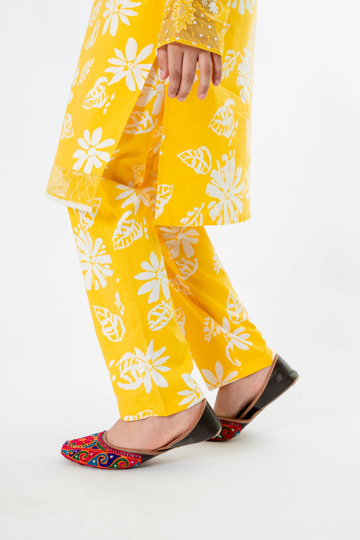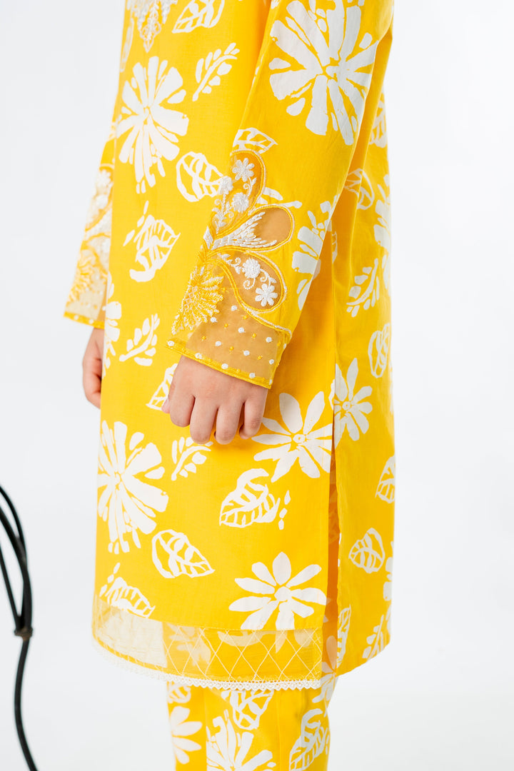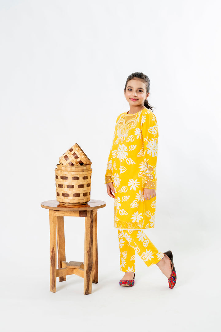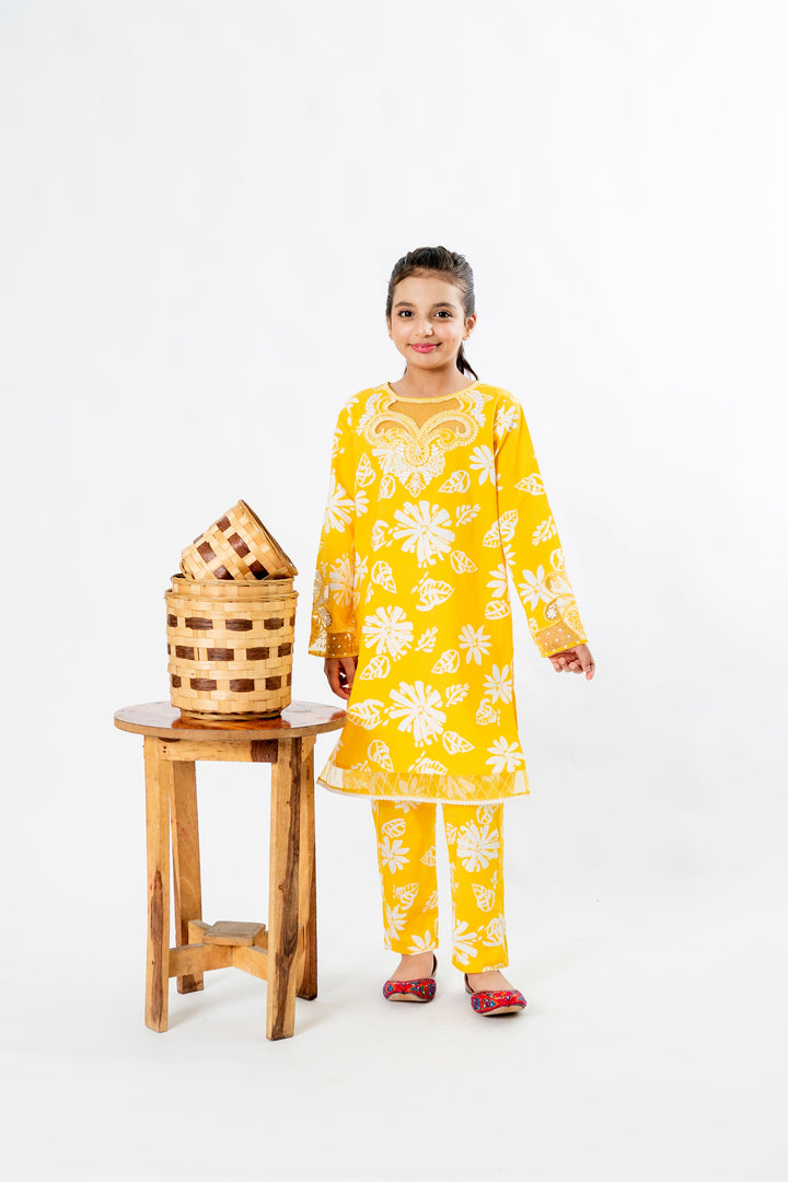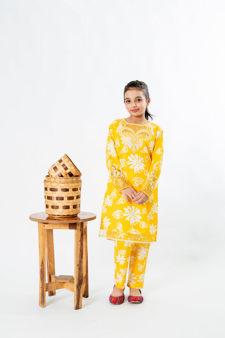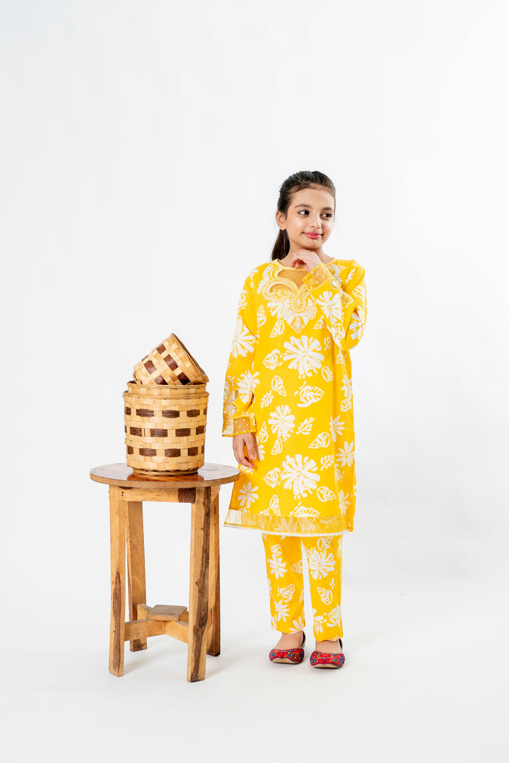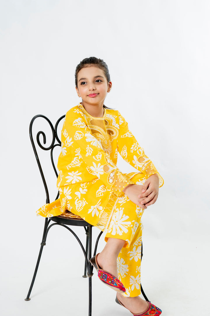 Al Qaswa - Girls Yellow Printed Embroidered Eid Outfit – 2-Piece Shirt & Trouser Coord Suit Set