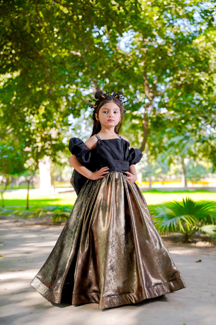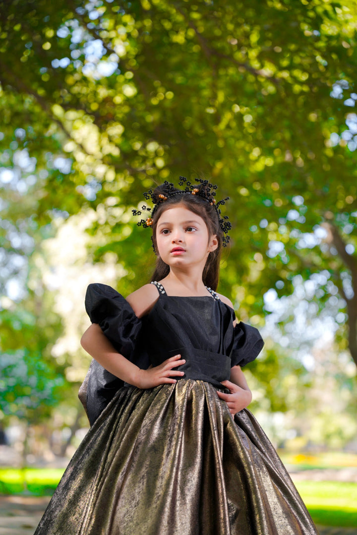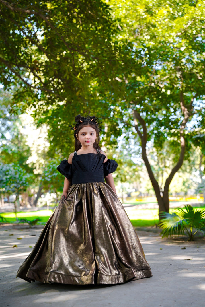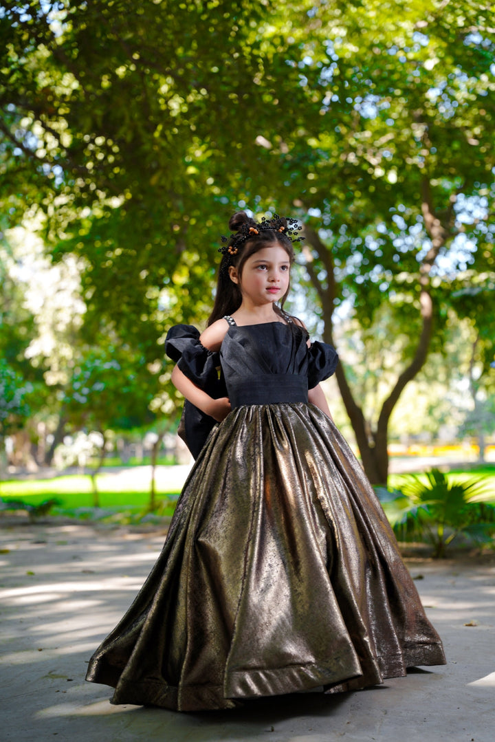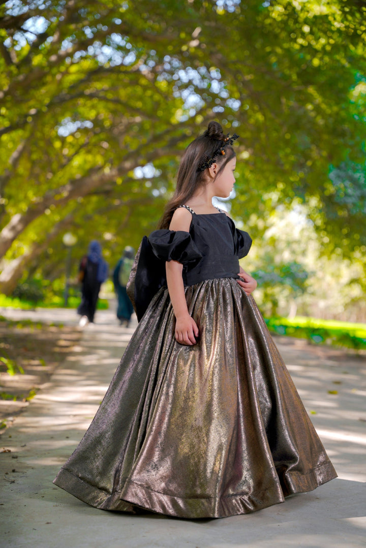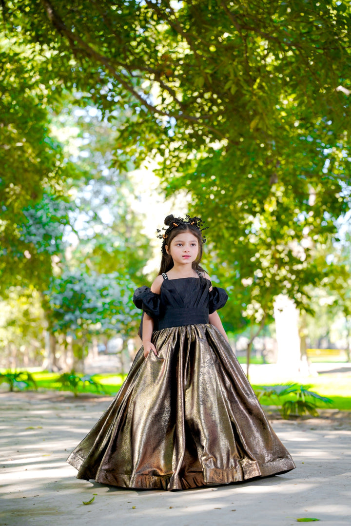 Introducing our latest addition to the new collection - the Gold Bar frock! Made with a luxurious blend of raw silk and Italian stone silk, this frock is perfect for your little girl. The elegant black and gold color adds a touch of sophistication to any occasion. Elevate her style game with this exquisite piece.