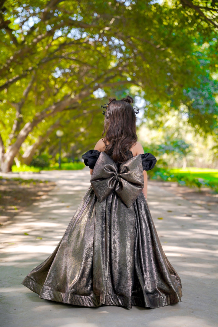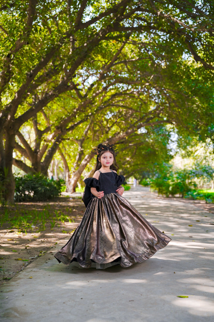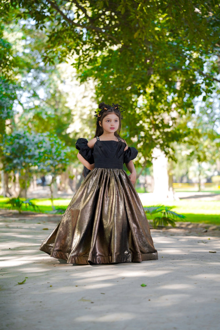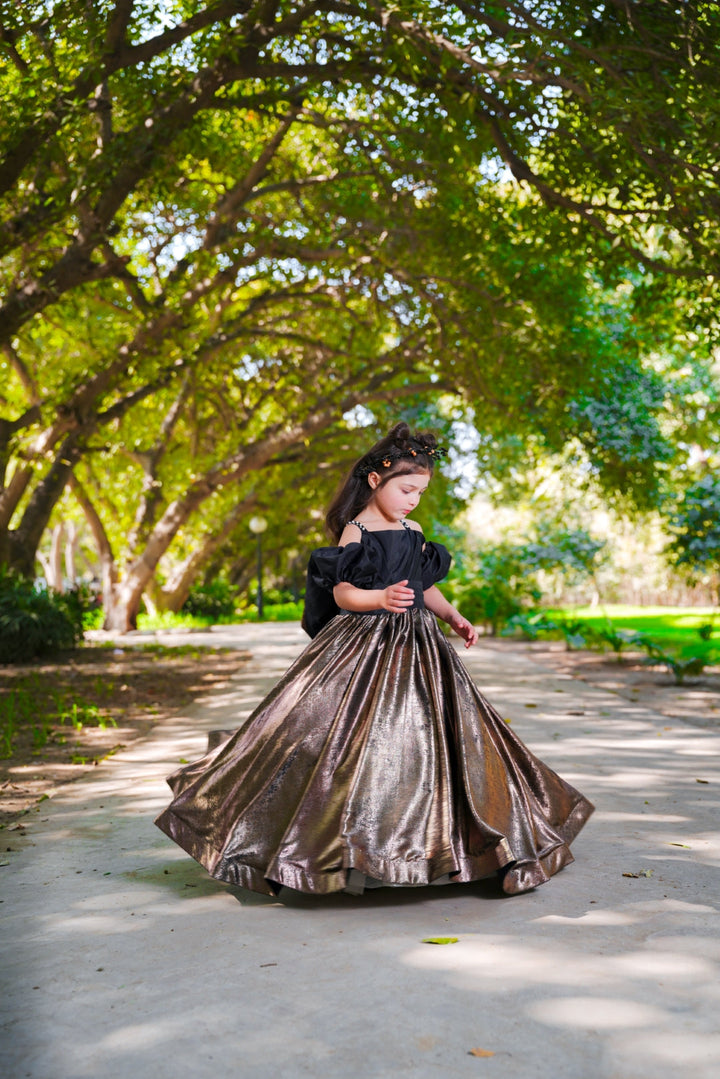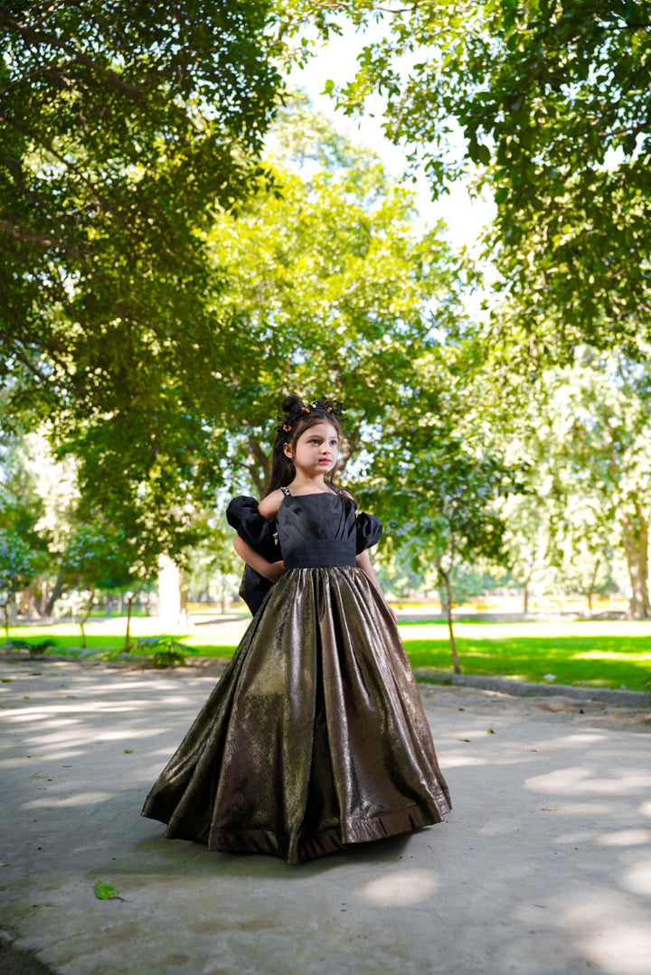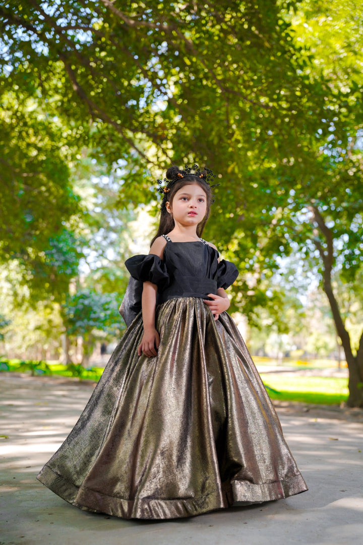 Introducing our latest addition to the new collection - the Gold Bar frock! Made with a luxurious blend of raw silk and Italian stone silk, this frock is perfect for your little girl. The elegant black and gold color adds a touch of sophistication to any occasion. Elevate her style game with this exquisite piece.