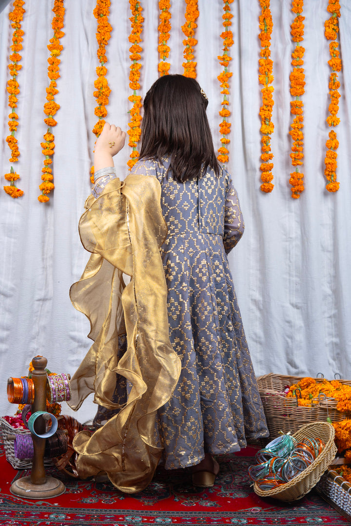 2pc: Purplish grey color Kalidar Maxi in crinkle chiffon fabric with golden sequined pattern all over styled with a beautifully made frilled dupatta in Golden organza, the maxi has lining all over and a frill of can can for perfect flare.