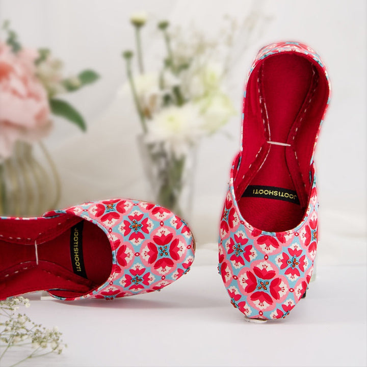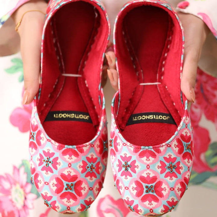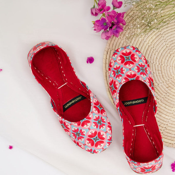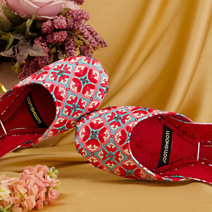 Make a bold statement with our "Vibrant Bloom" Khussas. This handcrafted pair feature a striking red and blue floral pattern, perfect for adding a pop of color to any outfit. The rich red interior provides a luxurious feel and comfortable fit. Ideal for those who love to stand out with unique, artisanal footwear.