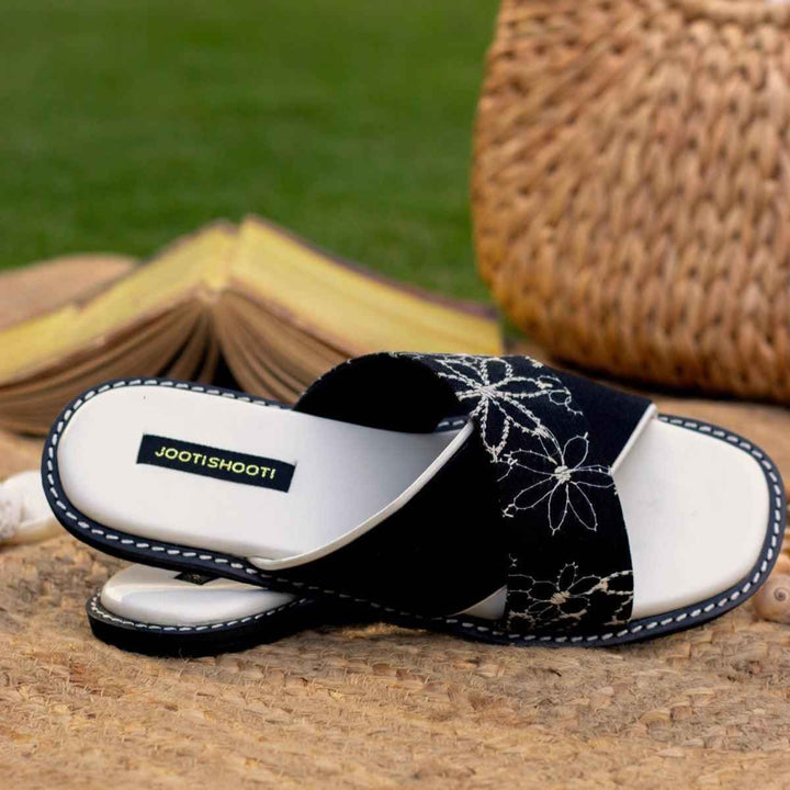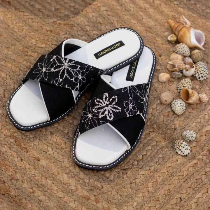 Unleash your inner fashionista with these must-have crossover slides, blending comfort and style seamlessly. From casual Fridays to weekend outings, these black and white floral slides add flair to any ensemble.