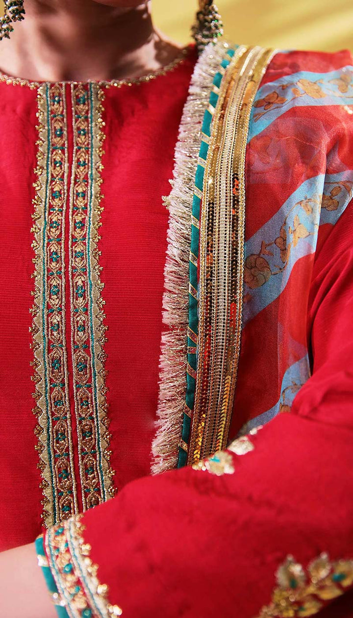A bright red raw-silk shirt features reshum, tilla and badla embroideries including the neckline & sleeves the daaman chalk and sleeves feature contrasting piping. The outfit is completed with a printed detailed organza dupatta & raw silk chatta-patti sharara pants.
