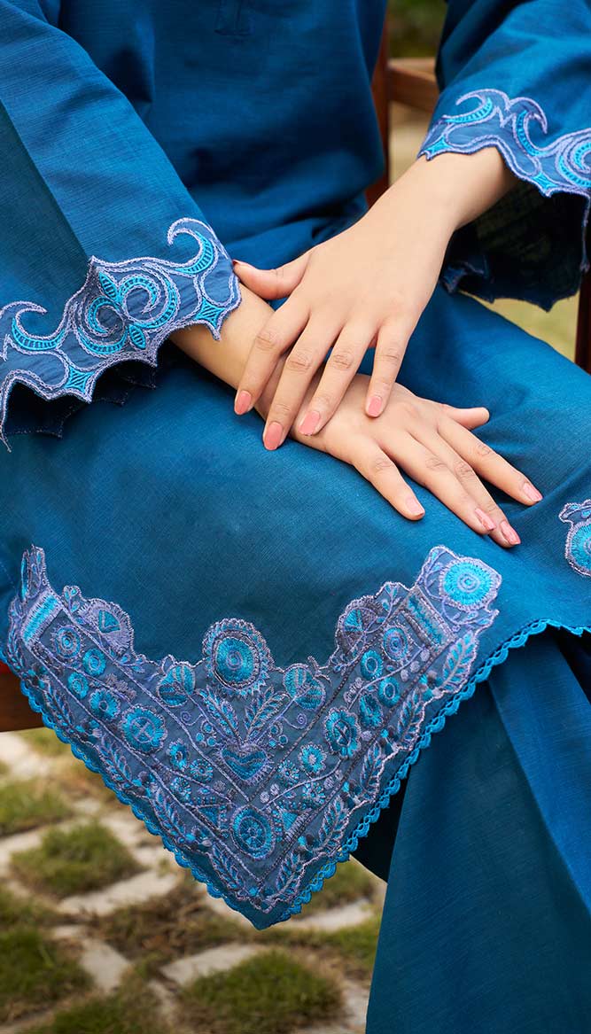 “Kaif”, draped in a deep blue, adds a serene element to your outfit. The exquisite patchwork on the sleeves and hemline combines contemporary and elegance in a pleasing way. Its attractiveness is enhanced by the scalloped neckline, which makes it perfect for semi-formal events or informal get-togethers.