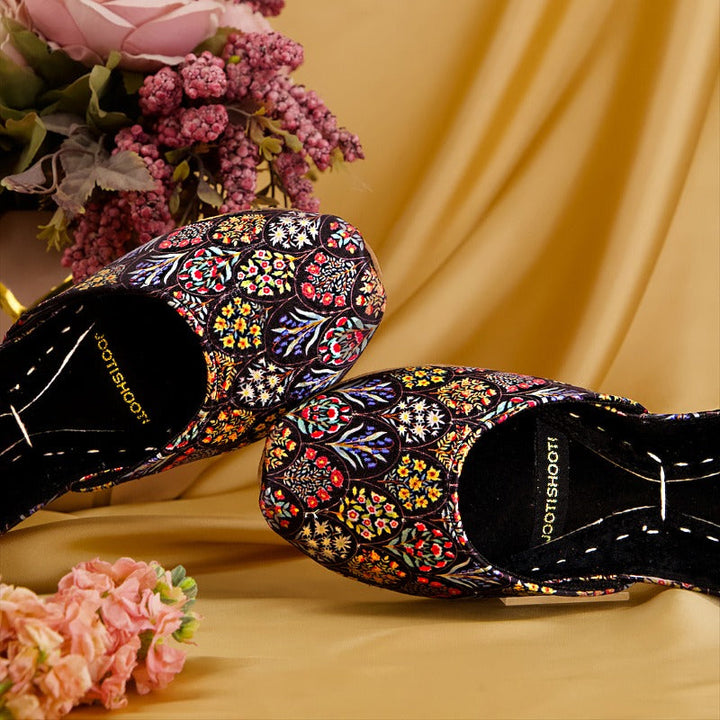 Embrace a blend of tradition and vibrancy with our "Laila" Khussas. This handcrafted pair features a rich, multi-colored floral pattern set against a deep, dark background, creating a captivating and sophisticated look. The plush black interior ensures both comfort and elegance. Perfect for adding a touch of artisanal charm to your ensemble.