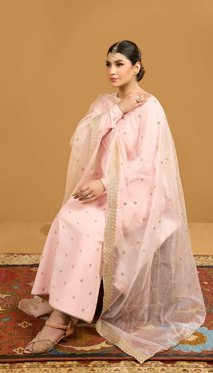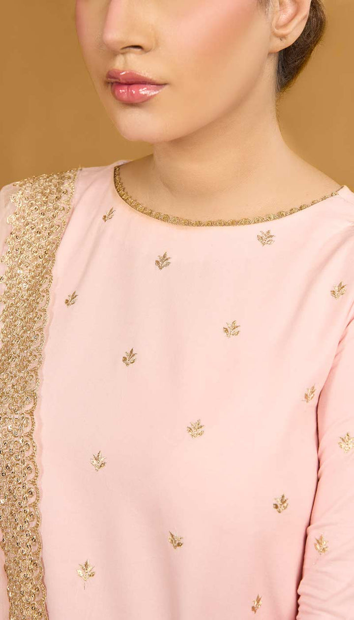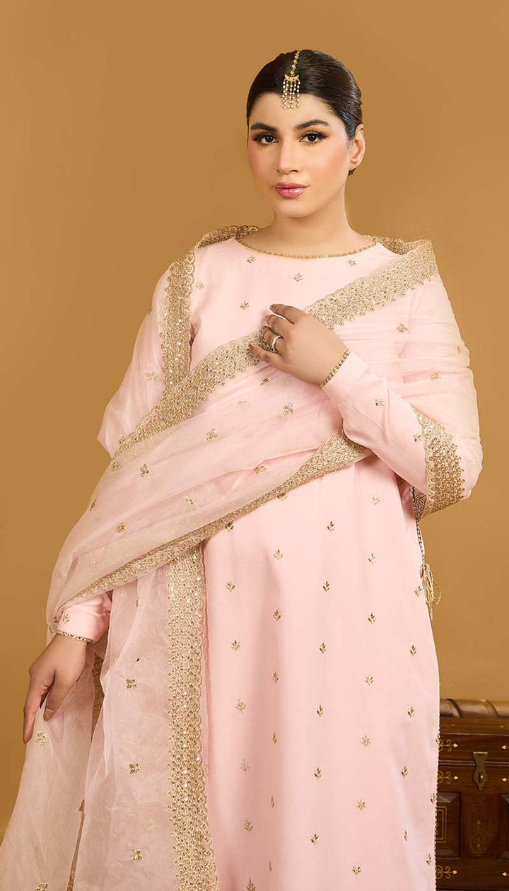 Enjoy the majestic beauty of our exclusive Tilla Work Dress, which combines culture and modern grace. “Laila” is precisely made with fine tilla work of art, known for its rich, shiny look.