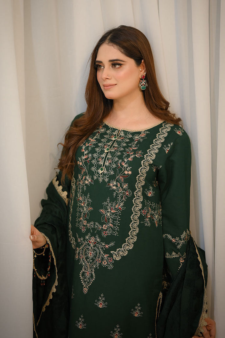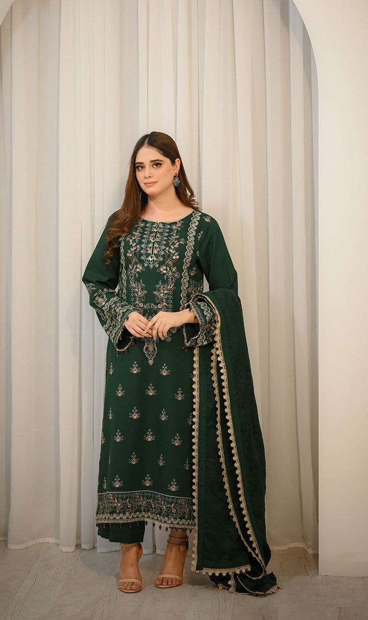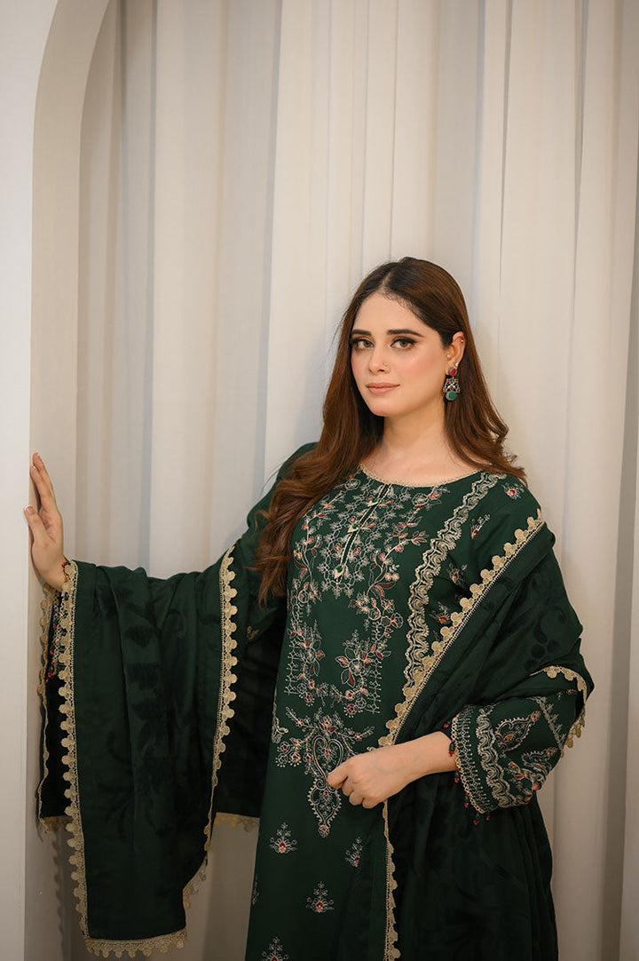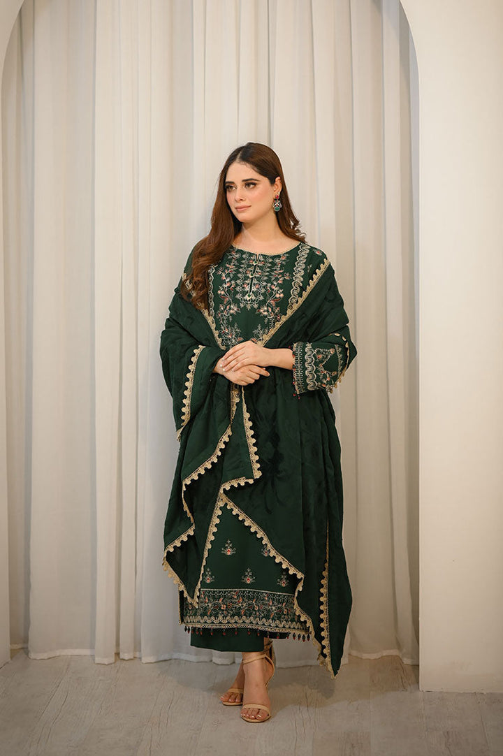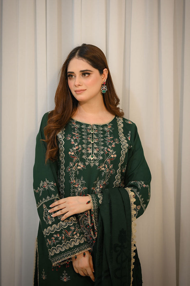 Experience refined elegance with the BOTTLE GREEN-3PC Dhanak with emboss velvet shawl & embroidered Suit. The shirt features 100% premium Dhanak fabric with a delicately embroidered for a sophisticated touch. Complementing this, the Dhanak dyed trousers offer both comfort and style. The ensemble is completed with a Plushi Dhanak shawl, adding warmth and intricate detailing. This expertly crafted suit balances luxurious textures and refined embroidery for a polished, versatile look.