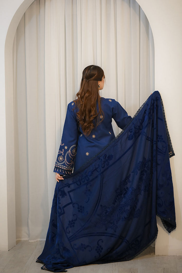 This elegant 3-piece suit features a 100% dhanak shirt with intricate embroidery on the front and sleeves, complemented by a dyed back and a yard embroidered hem patti for a refined finish. The matching dhanak trousers offer comfort and durability, while the emboss velvet shawl with detailed embroidery completes the ensemble, providing warmth and style. Perfectly balanced for both formal and semi-formal occasions, this outfit combines quality fabrics with expert craftsmanship for a sophisticated look.