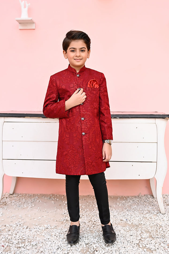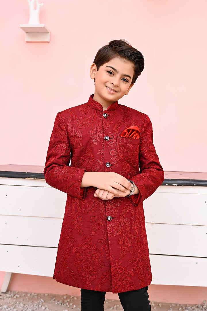 The sherwani is made up of a vibrant maroon Mysore fabric, which adds a bold and striking element to the outfit. It’s designed with intricate embroidery, showcasing traditional patterns and motifs.