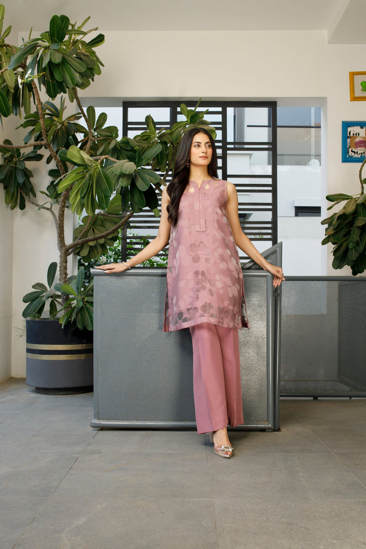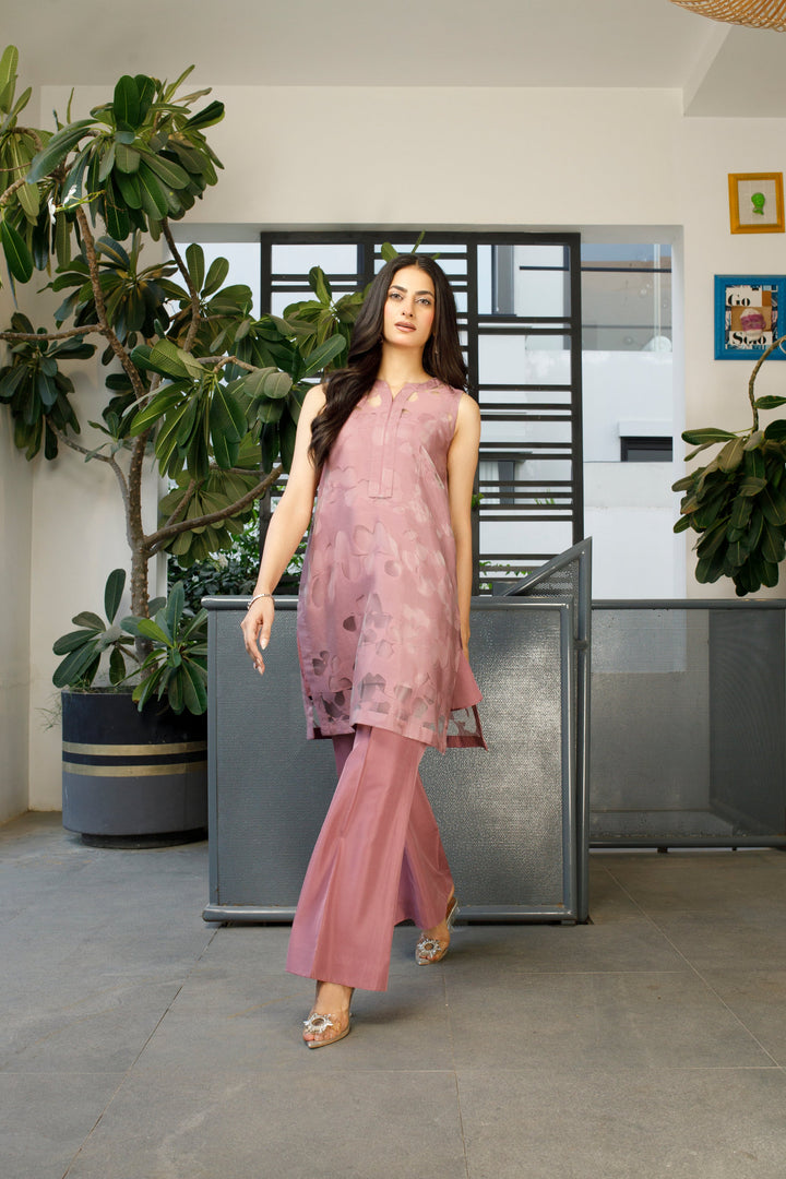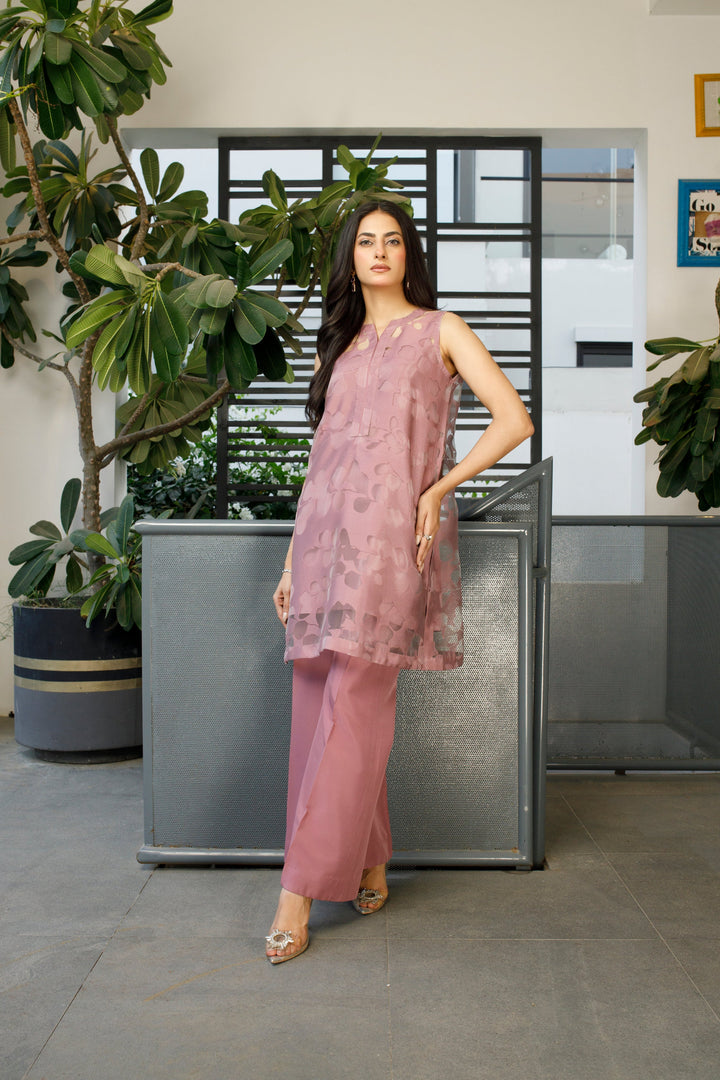 This outfit showcases a chic and elegant mauve ensemble, perfect for semi-formal occasions. The sleeveless tunic features a subtle floral-patterned overlay, adding depth and texture to the lightweight fabric. Paired with bell-bottom trousers, this look blends classic sophistication with a touch of retro charm. The wide-leg silhouette of the trousers adds a graceful flow, enhancing the overall elegance. Styled with statement jewelry and embellished flats, this outfit is ideal for daytime gatherings or evening soirées, exuding effortless poise and modern femininity.