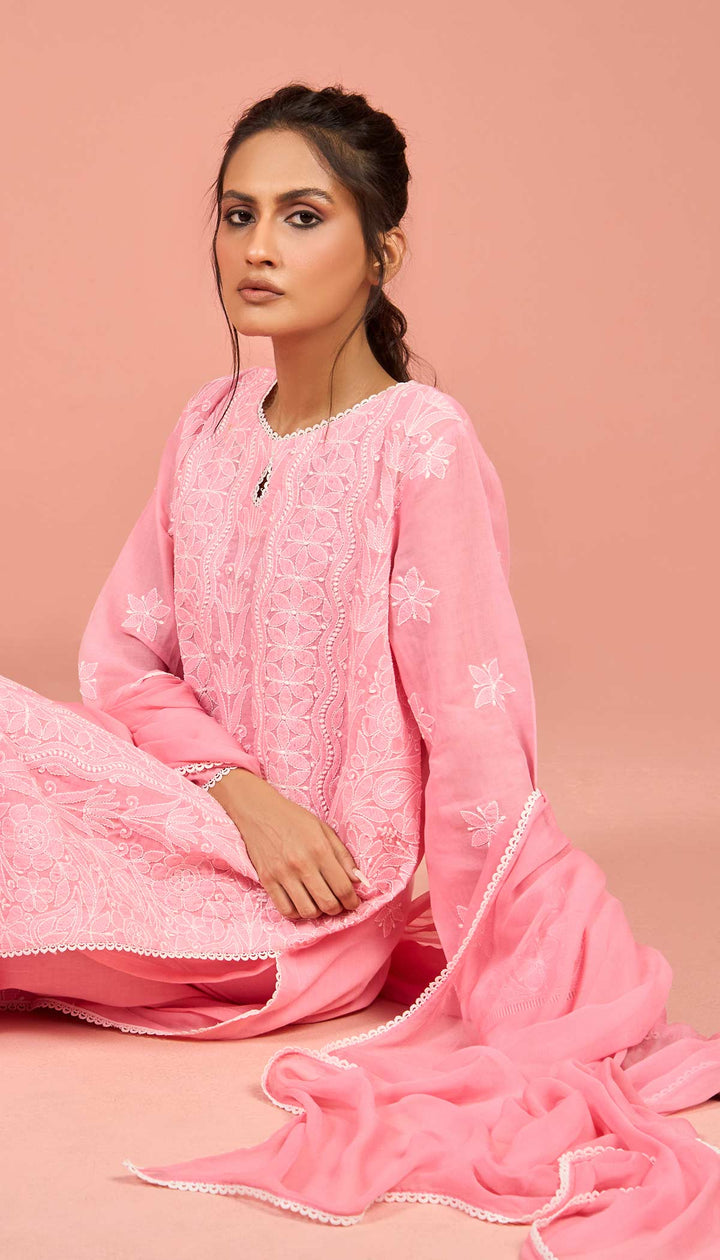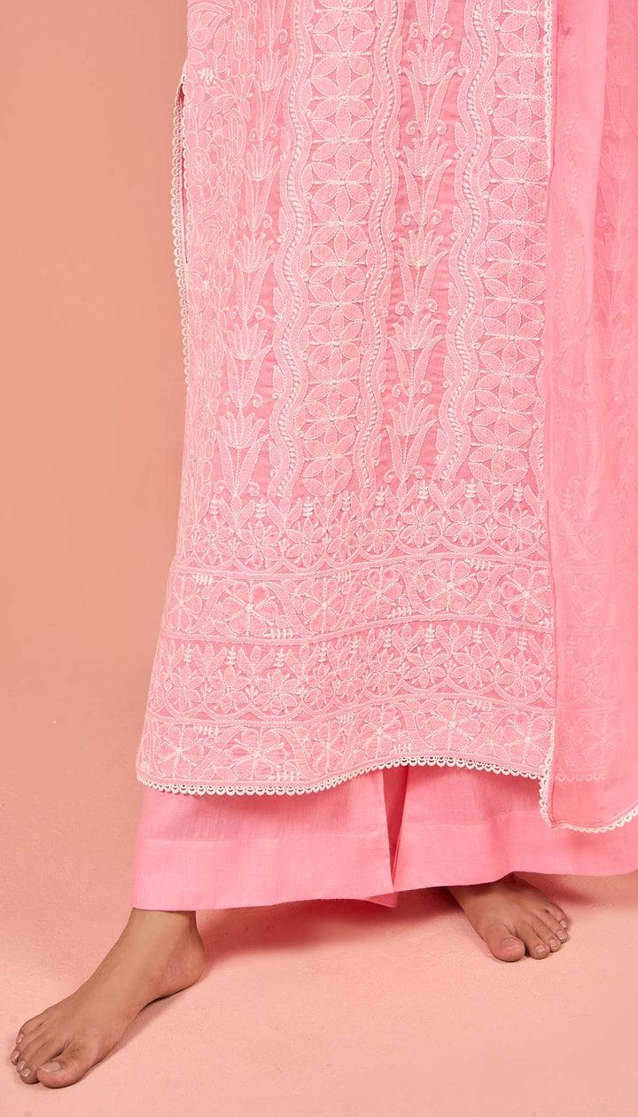 Please note that the Indian chikankari design may differ from the image due to its unique handcrafted nature, where each design is one-of-a-kind and can't be mass-produced. Hence showcasing the beauty of this old-age Indian craft. However, the outfit's stitching details and color will match the image.