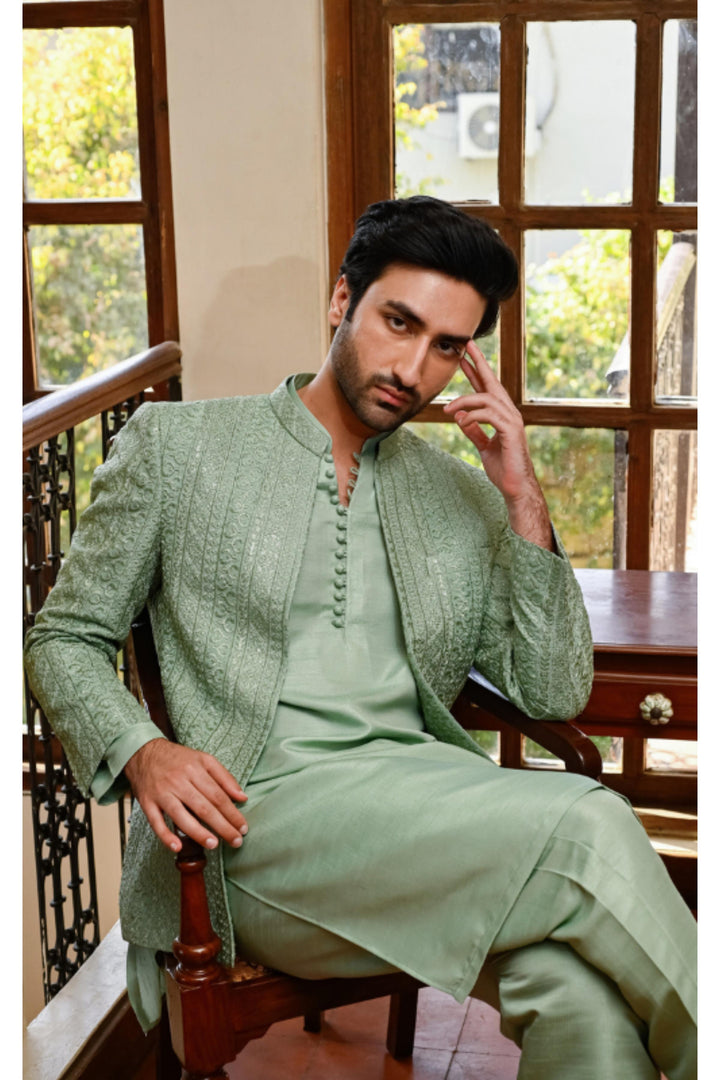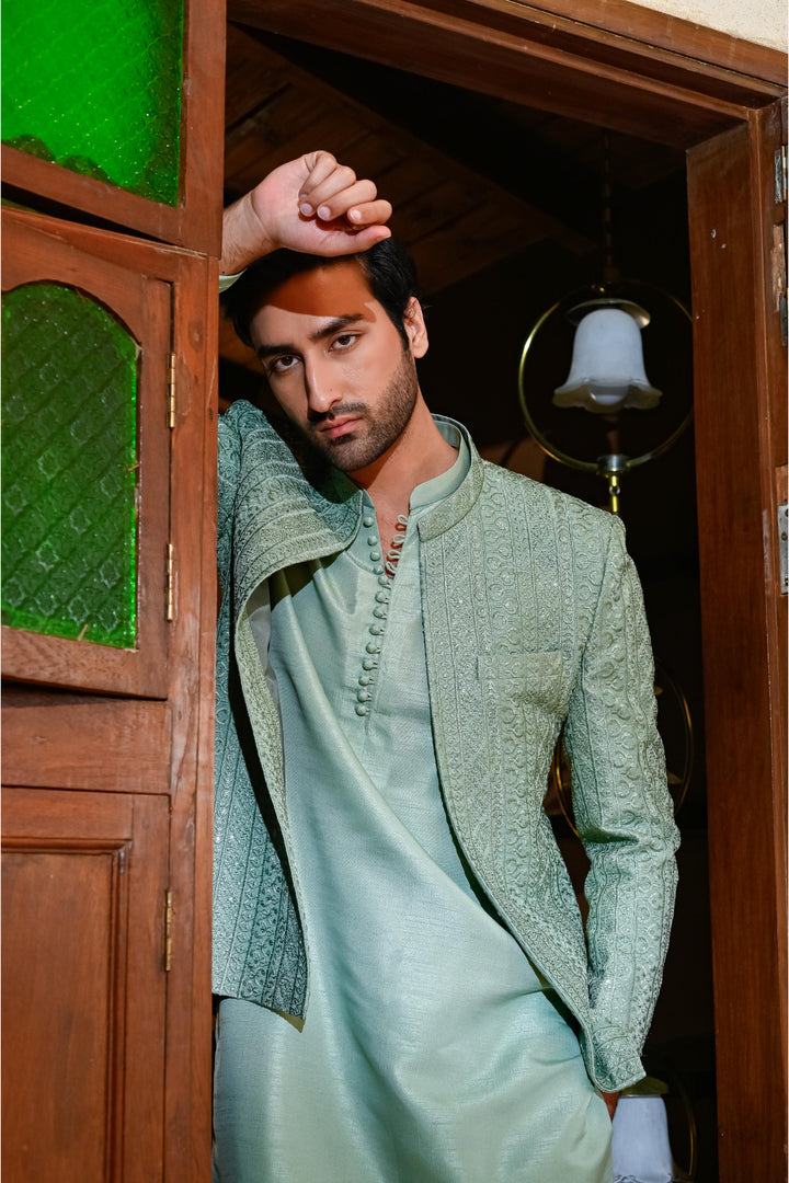 Mint Green Self-Embroidered Front Open Prince Coat