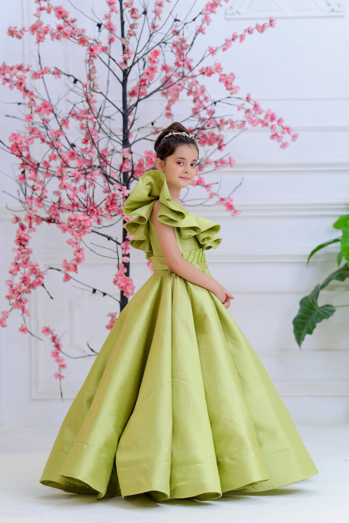 "Discover the ethereal beauty of the MINT ROSE frock from our Luxury collection. Adorned in a refreshing green hue and crafted with delicate silk and Bareeze net, this dress is a blend of elegance and whimsy.