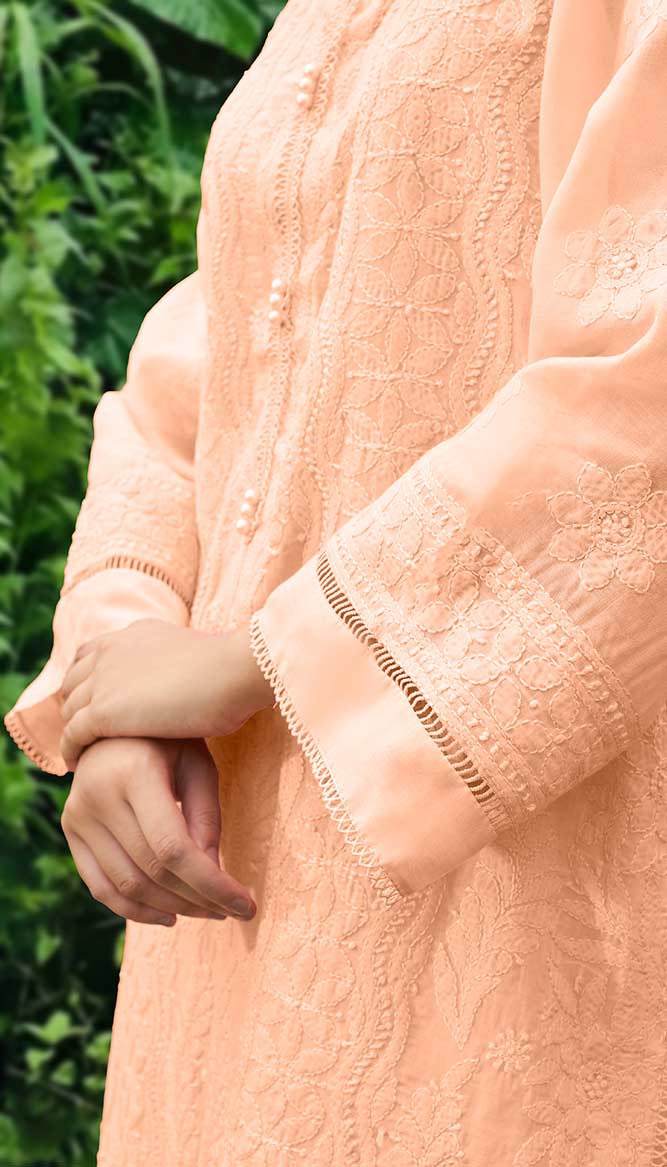 The “Mirage” shirt will give your outfit a touch of refinement. The hand-embroidered chikankari work adds charm, and the vivid peach color makes a striking statement. This shirt, made of lightweight, breathable cotton, is charming and ideal for warm-weather activities. This item celebrates culture and modern style with its beautiful chikankari workmanship, which highlights the skill and tradition of master artisans.