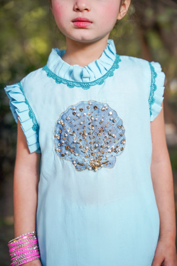 Maheen is a stunning chiffon fabric hand embellished shirt from our Eid collection. This sky-blue piece exudes elegance and adds a touch of sparkle to your wardrobe. Perfect for any special occasion, Mokshal is the epitome of timeless beauty and sophistication.
