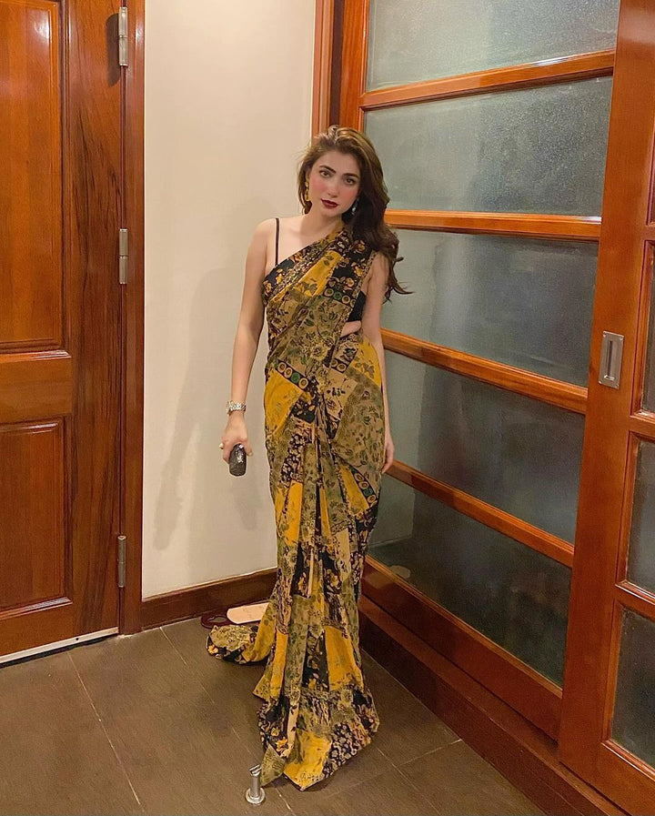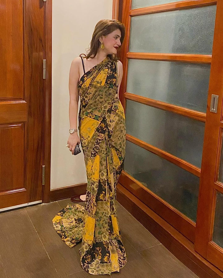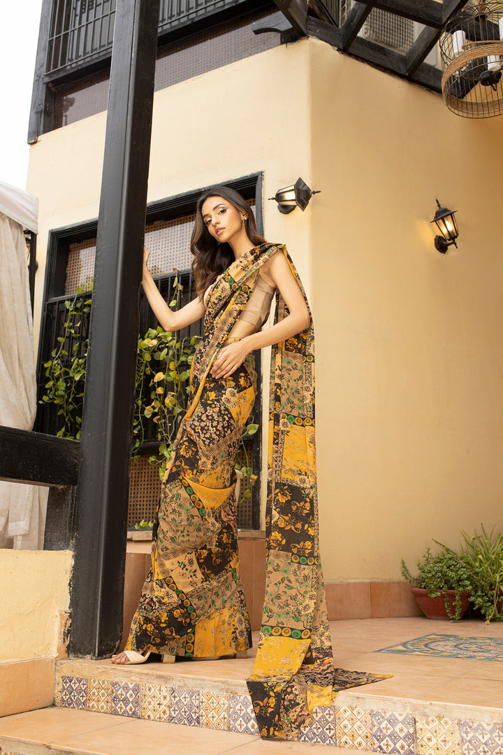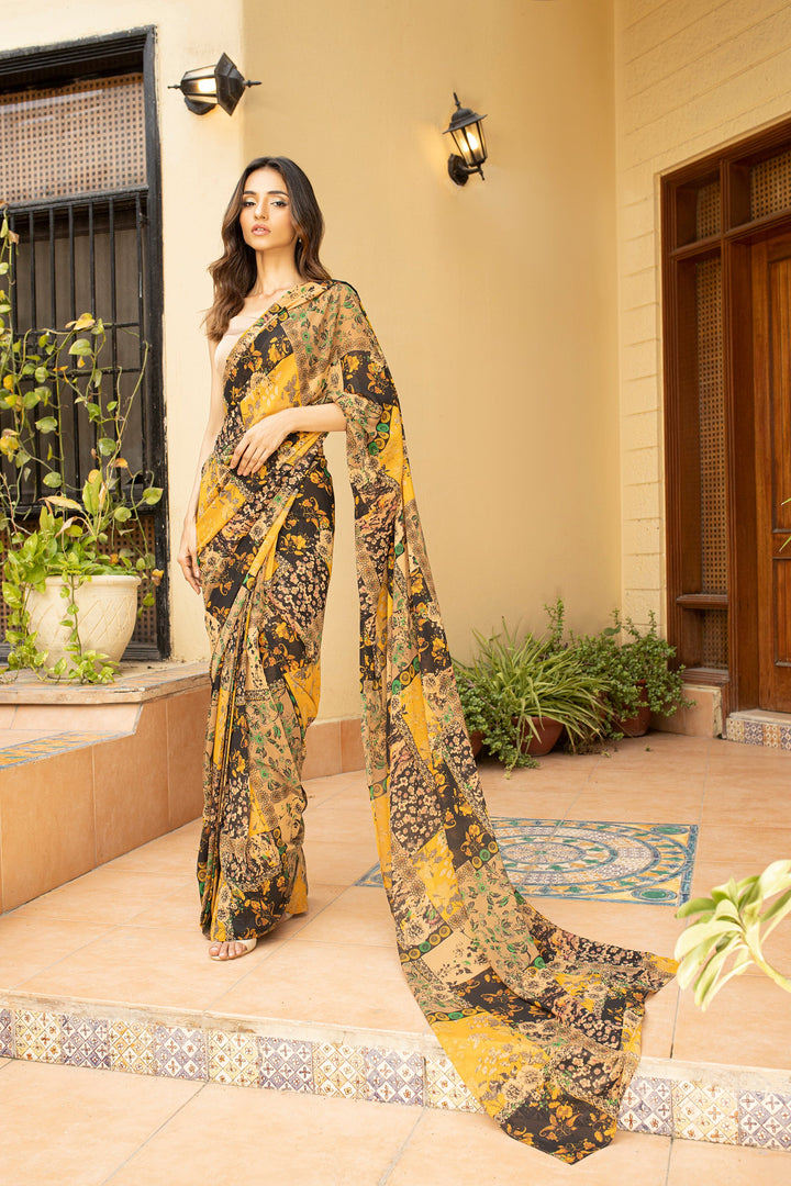 This summer saree is made of a lightweight crepe fabric and adorned with a delightful damask print that runs throughout the garment.