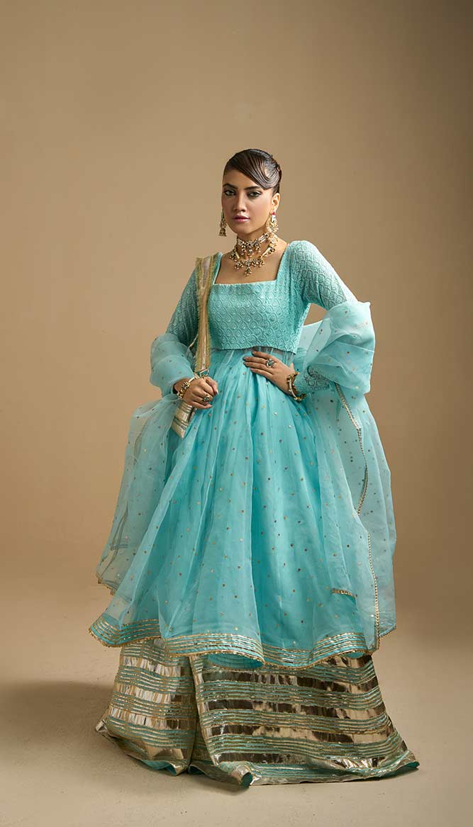 3 piece set includes a Shirt, Sharara, and Dupatta.