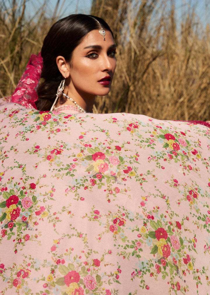 This is a stunning, embroidered lawn outfit in a soft pastel pink shade. The outfit features intricate floral embroidery in shades of maroon and pink, beautifully adorning the bodice, sleeves, and lower hemline. The embroidery is delicately detailed with fine threadwork an adding a touch of elegance. The long, flared silhouette of the dress gives it a graceful and flowy look, making it perfect for formal occasions. The sleeves are adorned with embroidered cuffs, enhancing the regal appeal. The ensemble is paired with matching trousers, printed chiffon dupatta also have a subtle embroidered organza border for a cohesive and sophisticated finish. This outfit is a perfect blend of traditional craftsmanship and modern elegance, ideal for festive events, weddings, or evening gatherings.