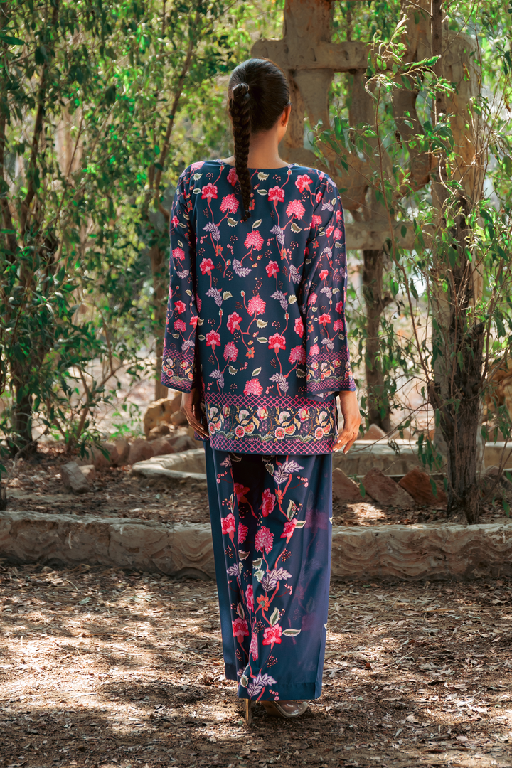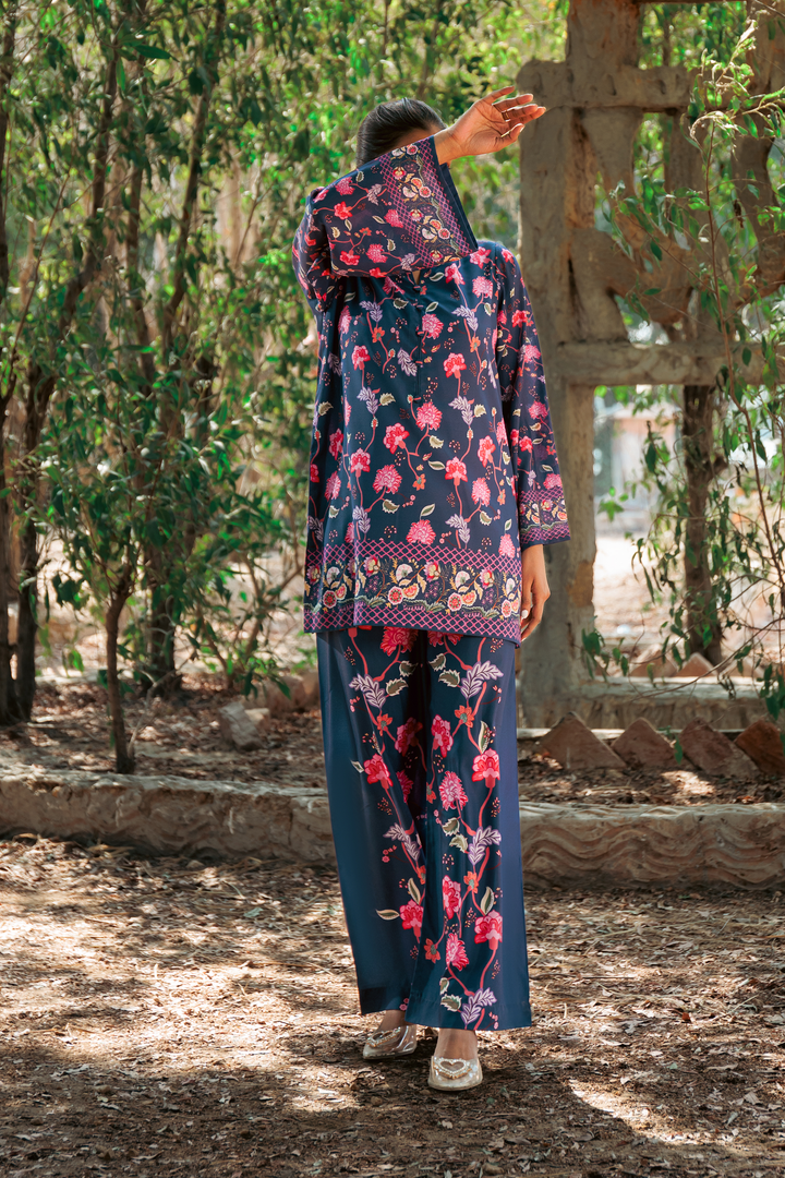 Step into effortless elegance with the Amira Co-Ord Set from the TS CO-ORDS collection. This ready-to-wear masterpiece is crafted from luxurious crepe fabric that’s wrinkle-free, all-season, and super comfortable. The vibrant floral-printed navy blue kurta, featuring intricate detailing on the neckline with full sleeves, is paired with wide-leg floral printed pants for a polished look. With high-quality stitching, Amira guarantees a flawless fit and enduring style.
