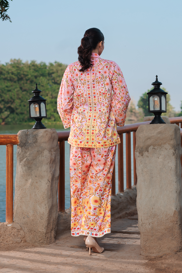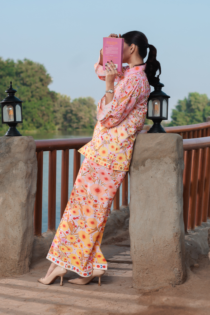 Step into effortless elegance with the Chiara Co-Ord Set from the TS.CO-ORDS collection. This ready-to-wear masterpiece is crafted from luxurious crepe fabric that’s wrinkle-free, all-season, and super comfortable. The vibrant floral-printed short kurta, featuring intricate detailing on the neckline and sleeves, is paired with wide-leg pants for a polished look. With high-quality stitching, Chiara guarantees a flawless fit and enduring style.