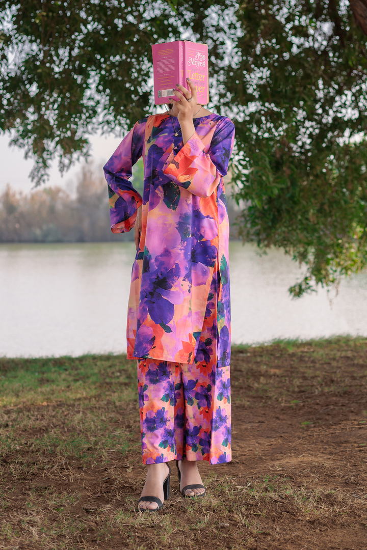 Elevate your wardrobe with the Isabella co-ord set, a stunning blend of vibrant artistry and unmatched comfort. This ready-to-wear ensemble features a floral burst of purple, orange, and pink tones, radiating energy and charm. The outfit includes a relaxed-fit kurta with a classic round neckline and elegantly designed full-length sleeves, paired with coordinating wide-leg pants to complete the look.