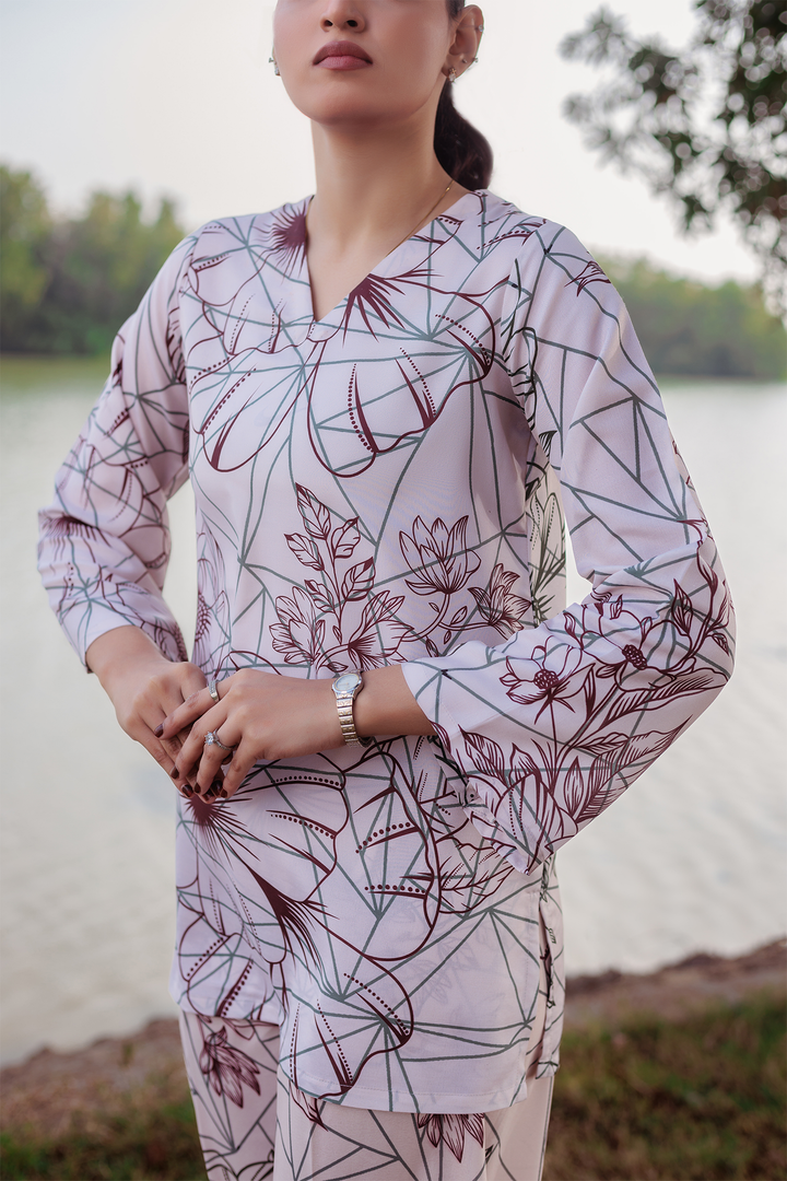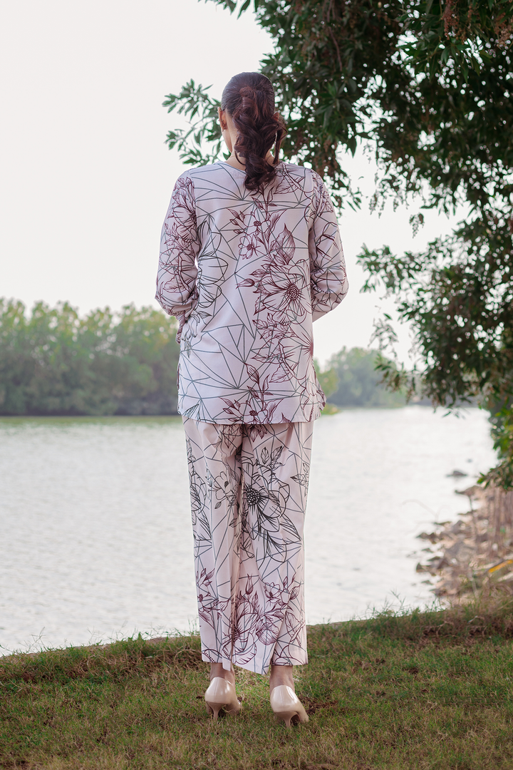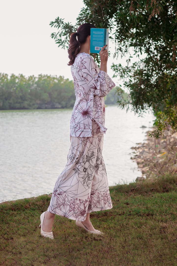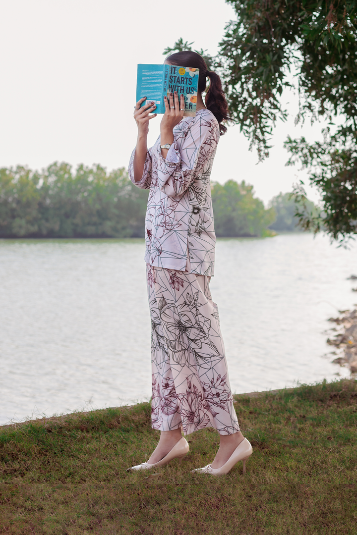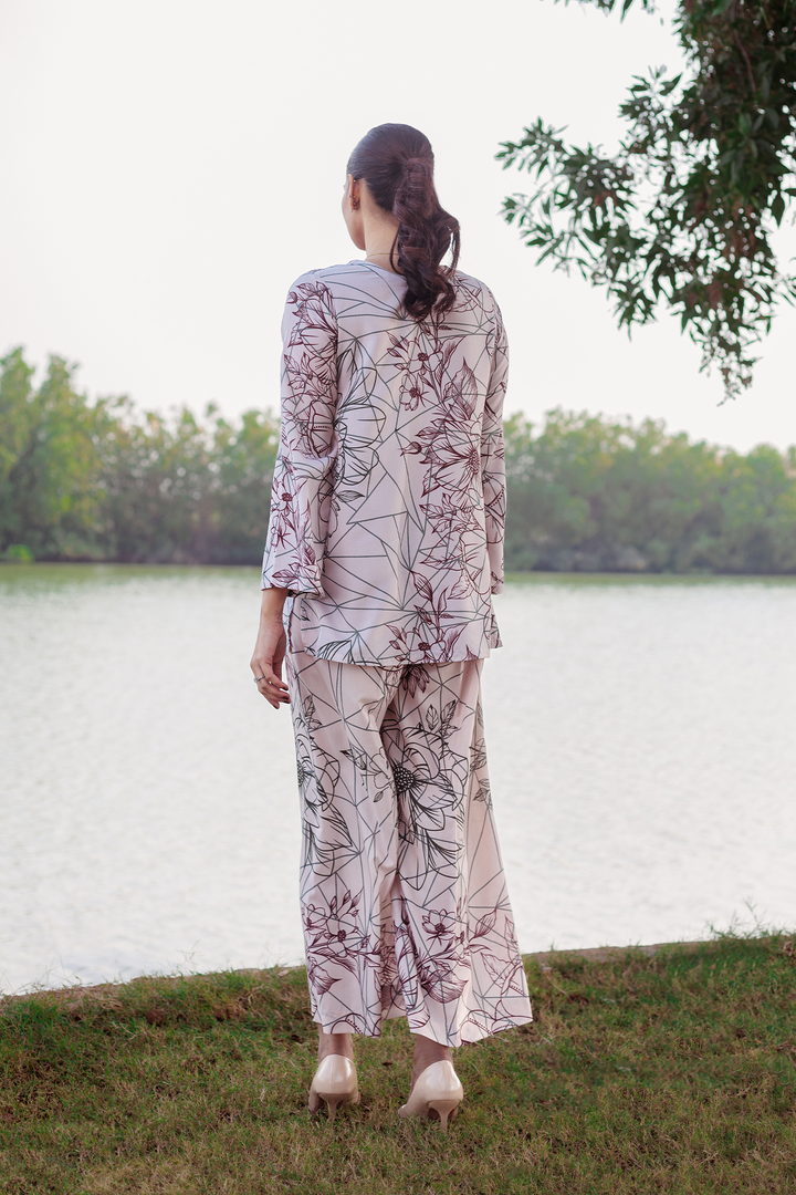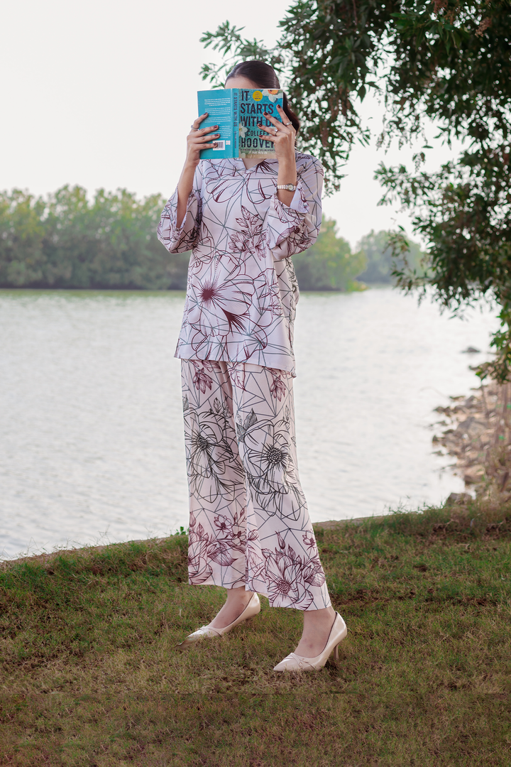 Experience the elegance and comfort of the Sofia Co-ords Set from the TS Co-ords Collection. Made from luxurious wrinkle-free crepe fabric, this ready-to-wear masterpiece features a floral outlines print and intricate detailing. The short kurta and wide-leg pants offer a polished look with high-quality stitching for a flawless fit and enduring style.