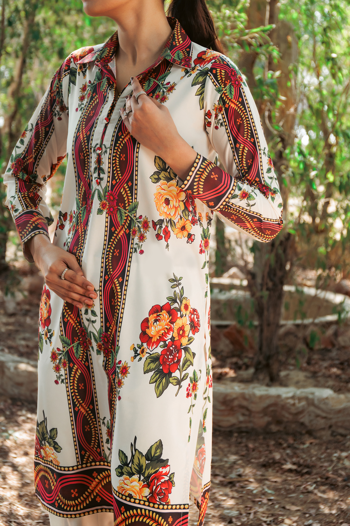 Step into effortless elegance with the Zayna Co-Ord Set from the TS.CO-ORDS collection. This ready-to-wear masterpiece is crafted from luxurious crepe fabric that’s wrinkle-free, all-season, and super comfortable. The vibrant floral-printed Off-White kurta, featuring intricate detailing on the neckline with full sleeves, is paired with wide-leg white off-white printed pants for a polished look. With high-quality stitching, Zayna guarantees a flawless fit and enduring style.