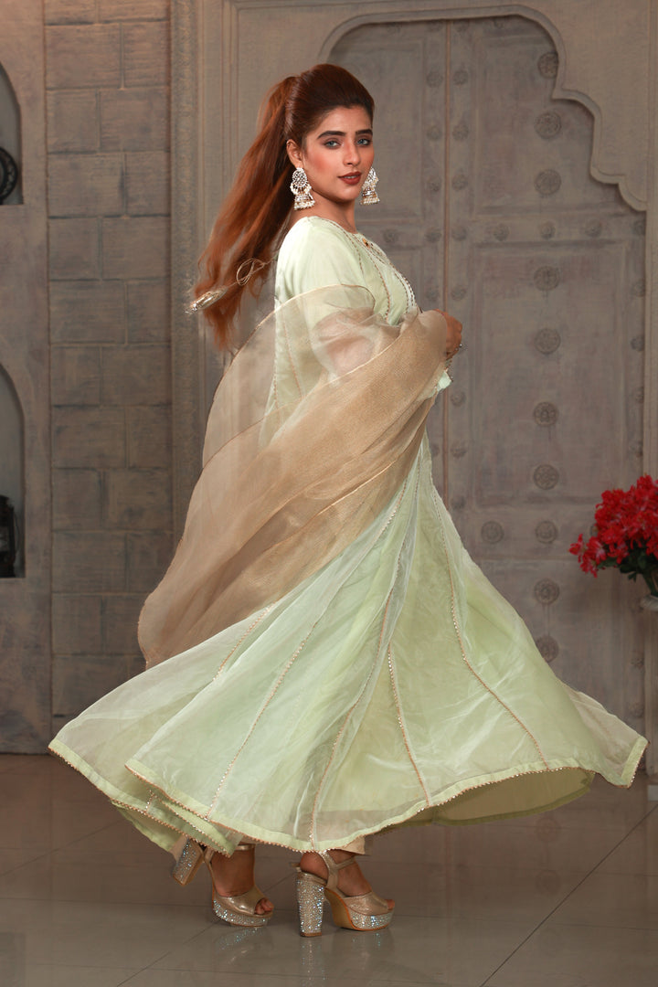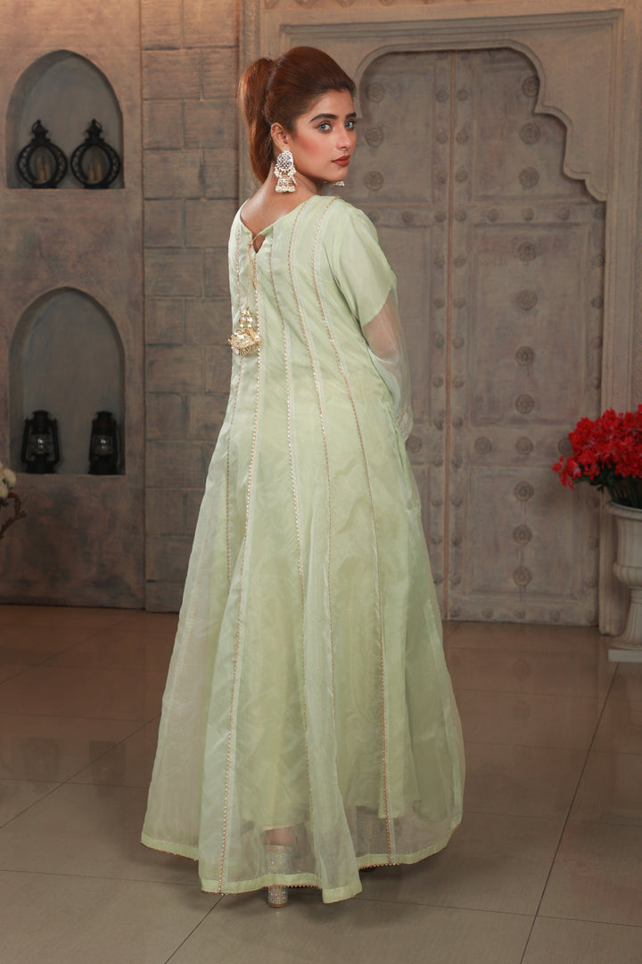 ‘Surili’ is one of our long frocks with exquisite golden ‘gota’ embroidery paired with a sophisticated dupatta that adds a bold touch to the outfit. The frocks classic embroidery complements the serene pista green fabric beautifully, while the golden dupatta gives the entire piece an elegant touch. ‘Surili’ is an absolute showstopper for formal events and special occasions, making every woman feel like royalty.
