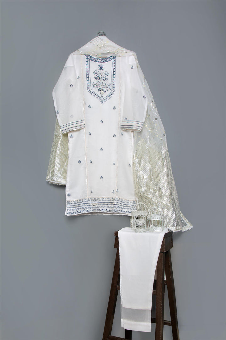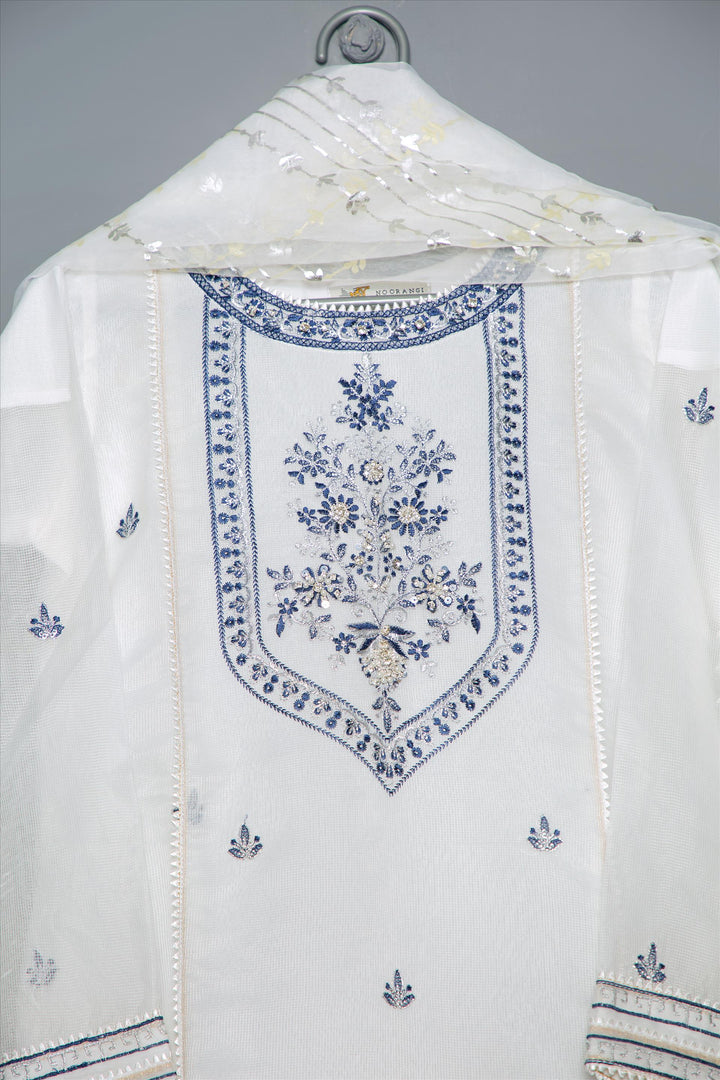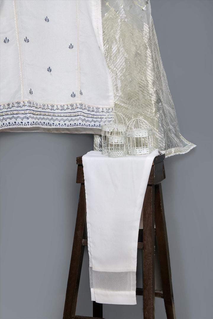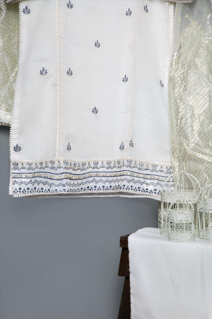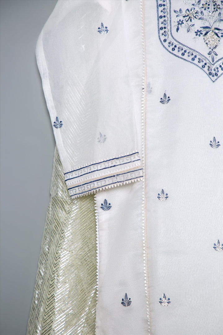 A dream comes to life with this ethereal ensemble featuring white Khaddi Net fabric tilla embroidery with contrasting hues of greek blue and Adda work detailing. A gorgeous silver foil printed dupatta and matching pants complete this dateless expression