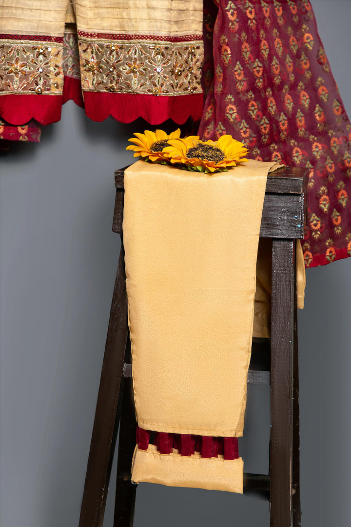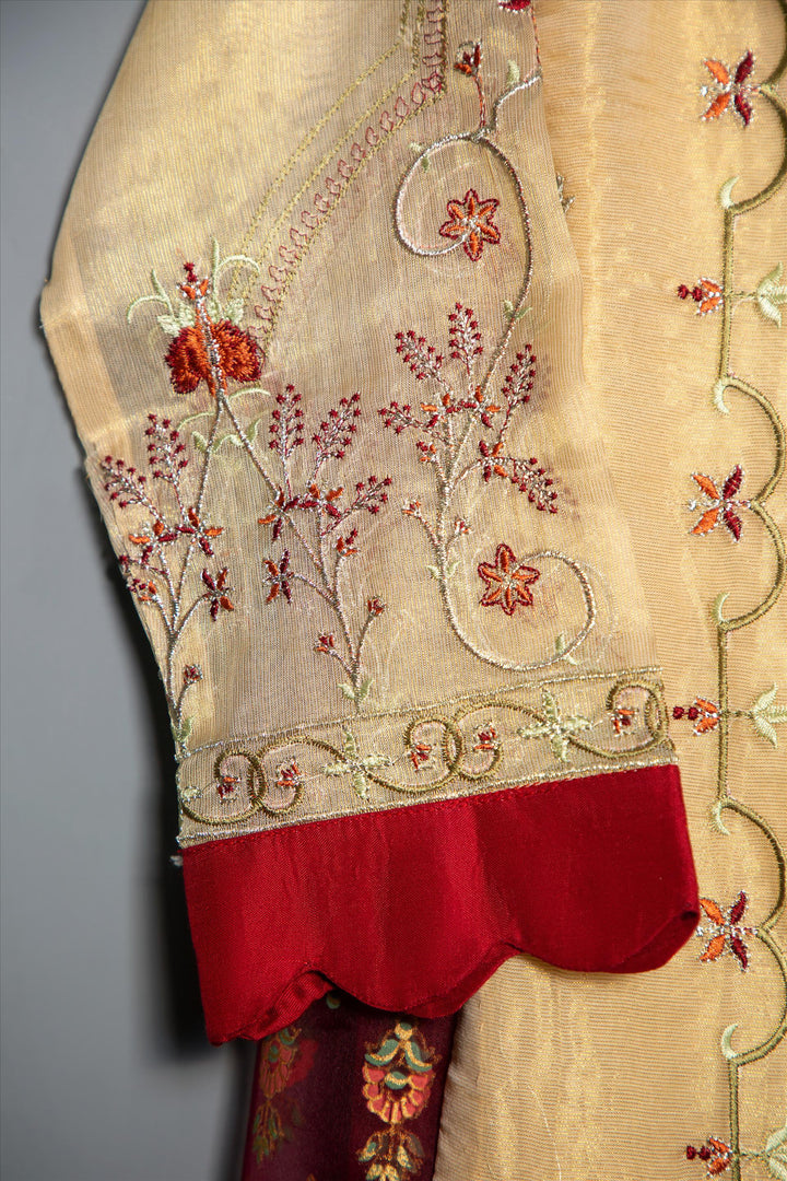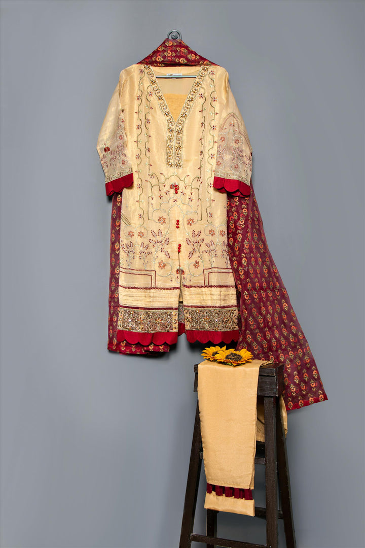 This gorgeous ivory is rendered on a heavily embroidered mesuri canvas that is encrusted with dainty tilla and thread work and Adda work detailing inspired by Mughal Era. It comes with a matching shalwar and screen paste print dupatta that too in marvellous shades to qualify as a must-have piece for this Eid festive season