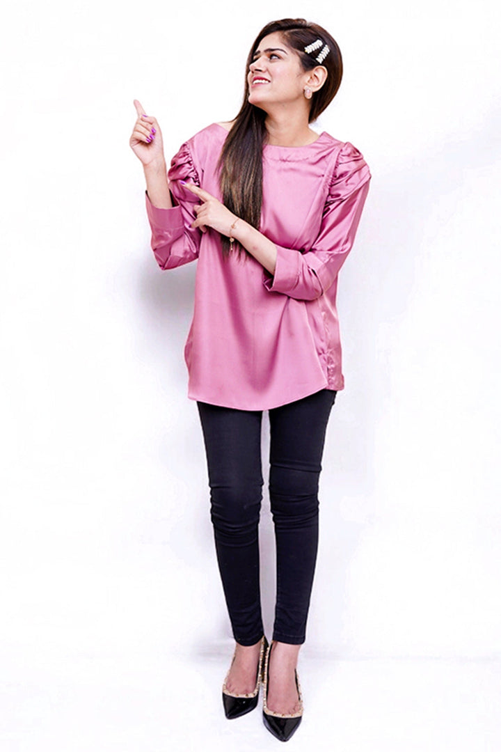 A luxurious pink Shamoze silk top with soft, voluminous puff sleeves. The smooth, lustrous fabric offers a refined sheen, while the puff sleeves add a playful, feminine silhouette. Ideal for a stylish and sophisticated look with a touch of elegance.