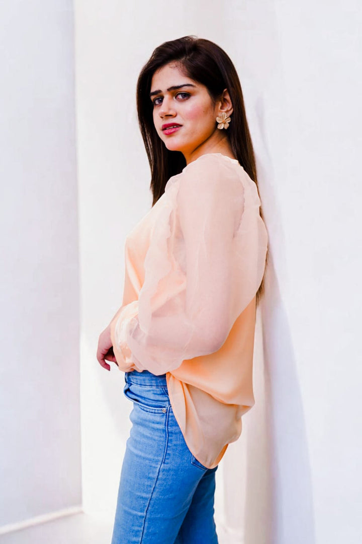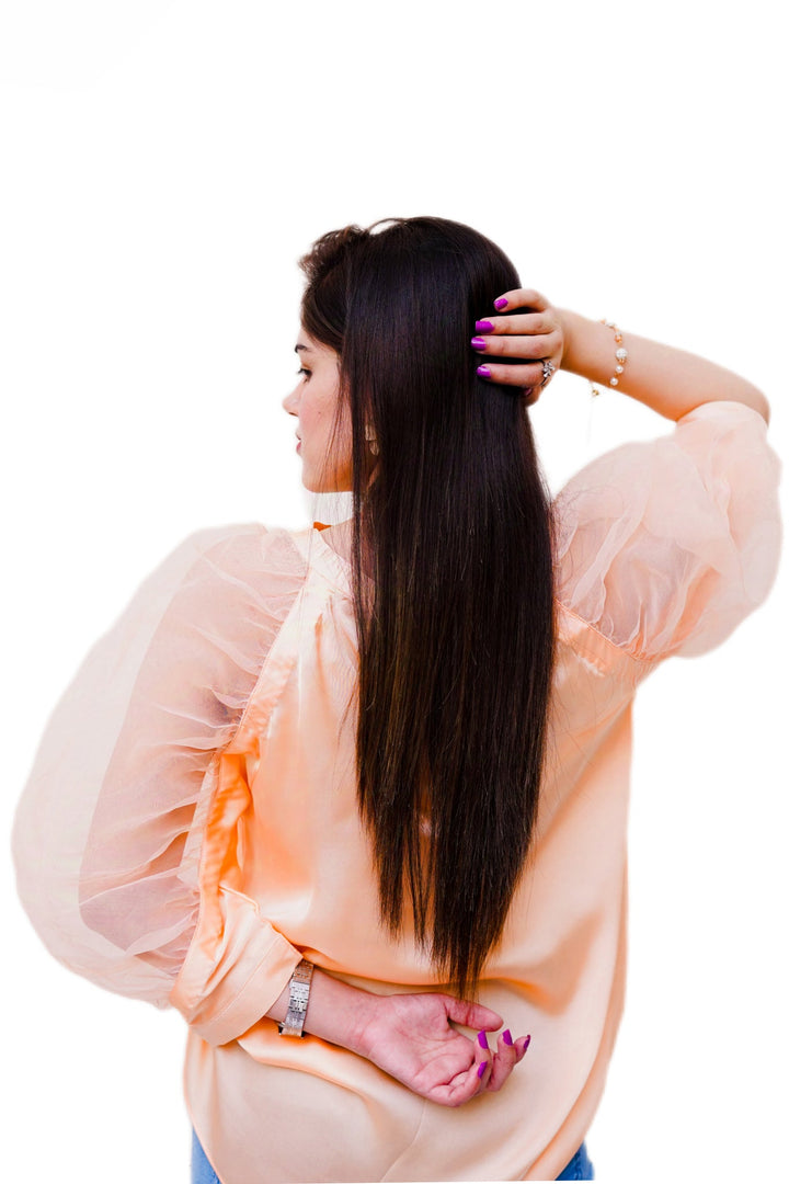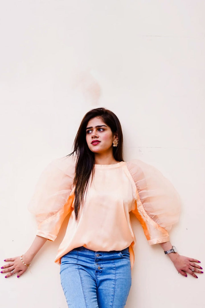 A graceful peach Shamoze silk top featuring a flattering boat-shaped neckline and dramatic puffy sleeves. The smooth, luxurious silk enhances the soft color, while the puffy sleeves add a bold, feminine touch, creating an elegant and sophisticated look.