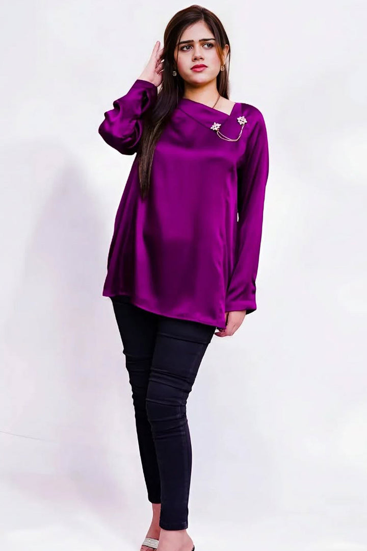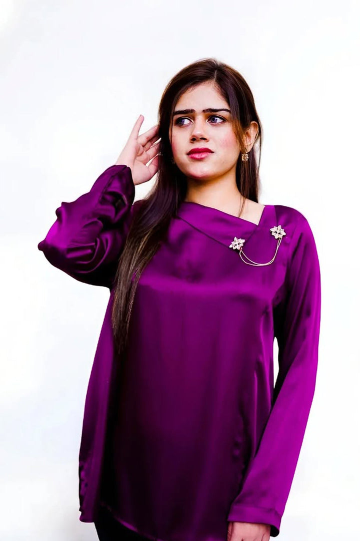 A stunning purple Shamoze silk top adorned with a handcrafted brooch. The vibrant color of the top is complemented by the intricate, handmade brooch, adding a touch of unique elegance and craftsmanship to the design. Perfect for a refined and stylish look.