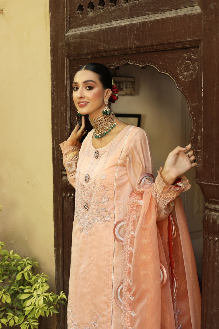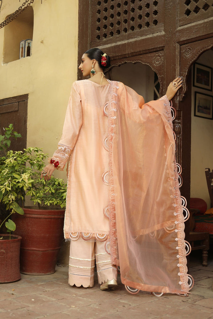 This Gorgeous ensemble is inspired by South Indian motifs with beautiful detailing of roselle sequence and dull gold tilla with peachy hues on a peach blush paper-cotton shirt. Coupled with matching pants and a finely crafted embroidered Organza Zarri dupatta to complete this stunning look for this Eid Festive season.
