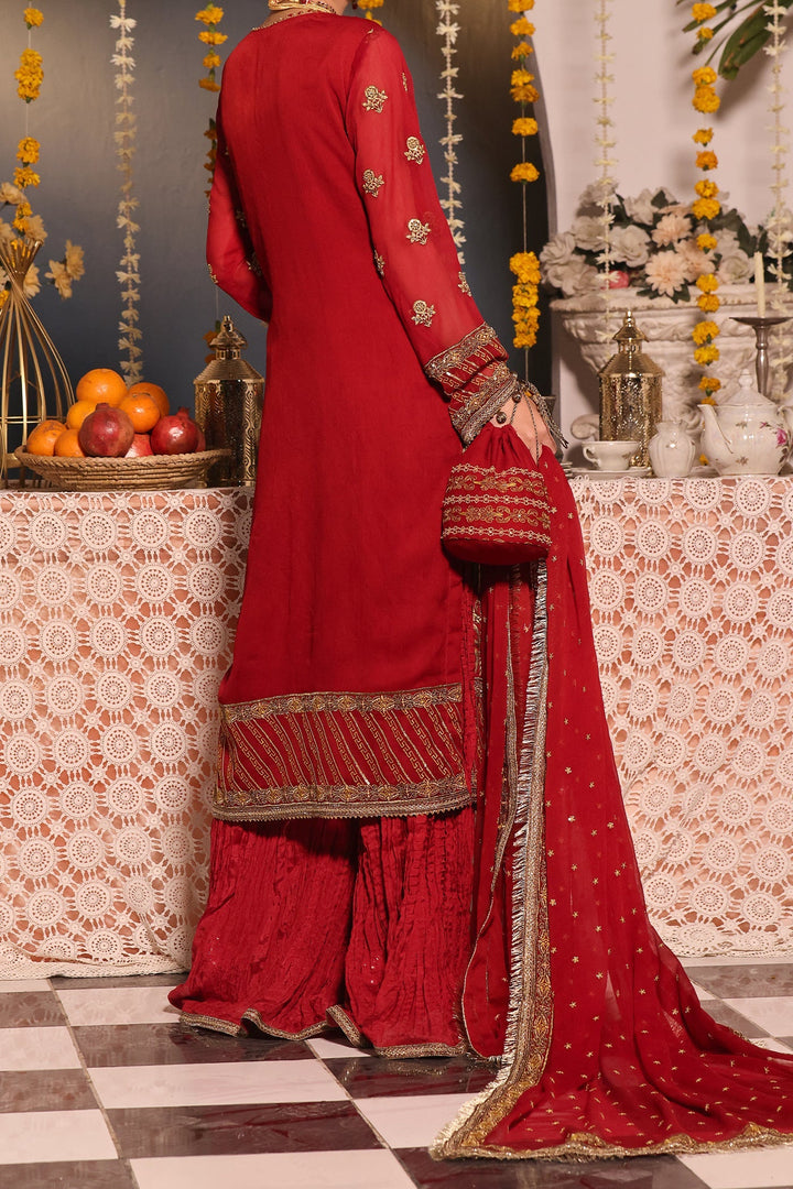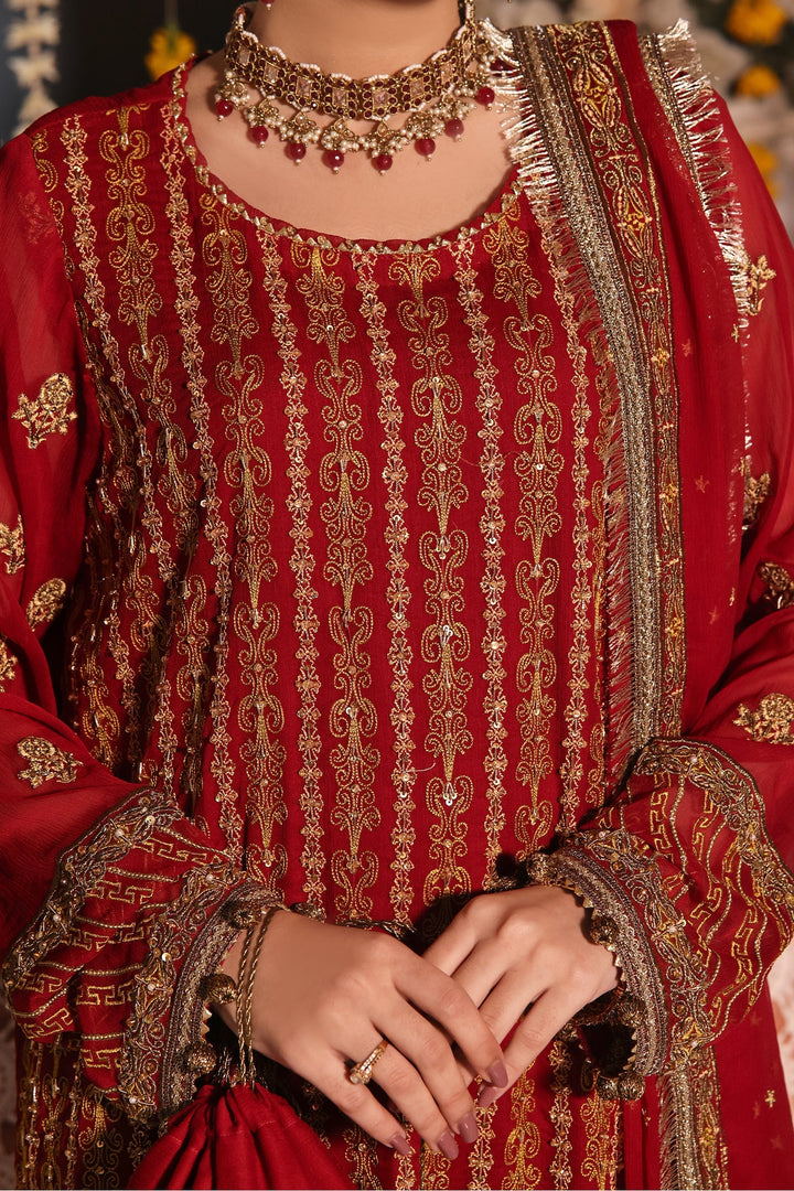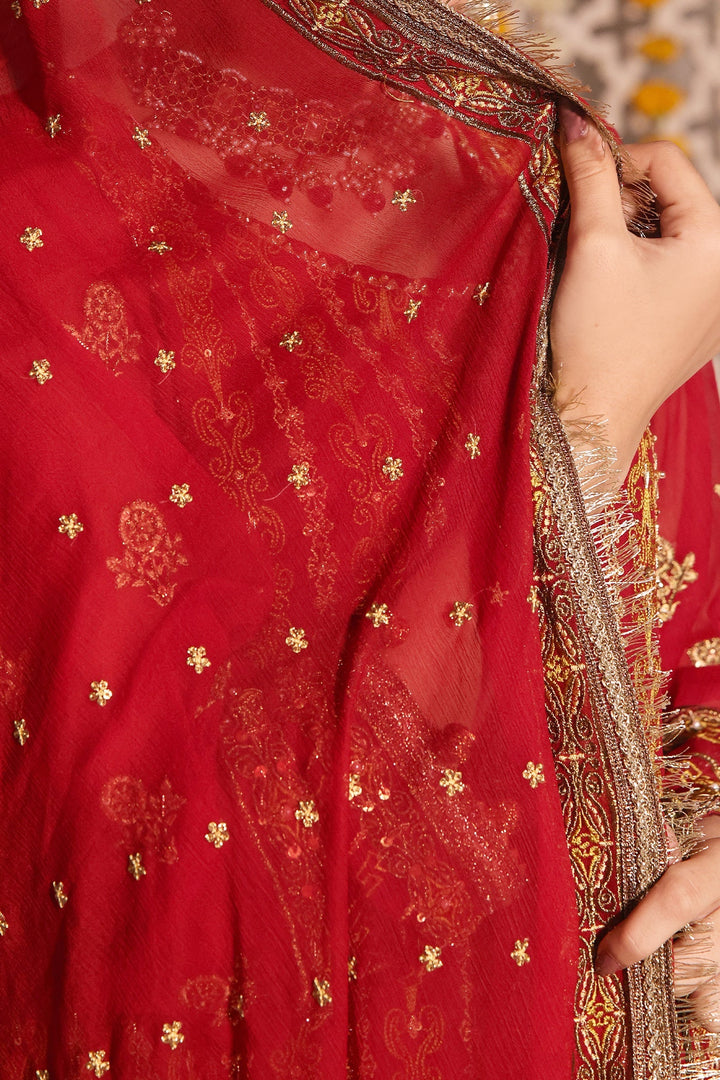 Imagine a symphony of gold hues on red cotton silk where innovation blends seamlessly in a captivating display of cultural richness and artistic expression. The embroidered in heritage are juxtaposed with contemporary motifs on the border, creating a mesmerizing contrast, like patterns shifting in the light. The red chiffon dupatta adorned with kiran, lace, and embroidery on borders adds depth to the allure.