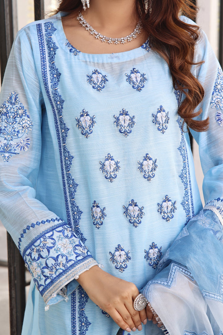 Achieve a stunning, show-stopping look with this luxurious traditional ensemble. A beautiful Munnar blue adorned with mesmerizing embroidery and scintillating embellishments, a classic straight trouser with a captivating zig-zag design organza dupatta completes this aesthetically rich composition, making it a perfect style statement for all your festive soirées.