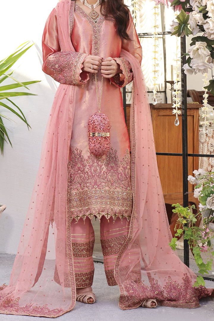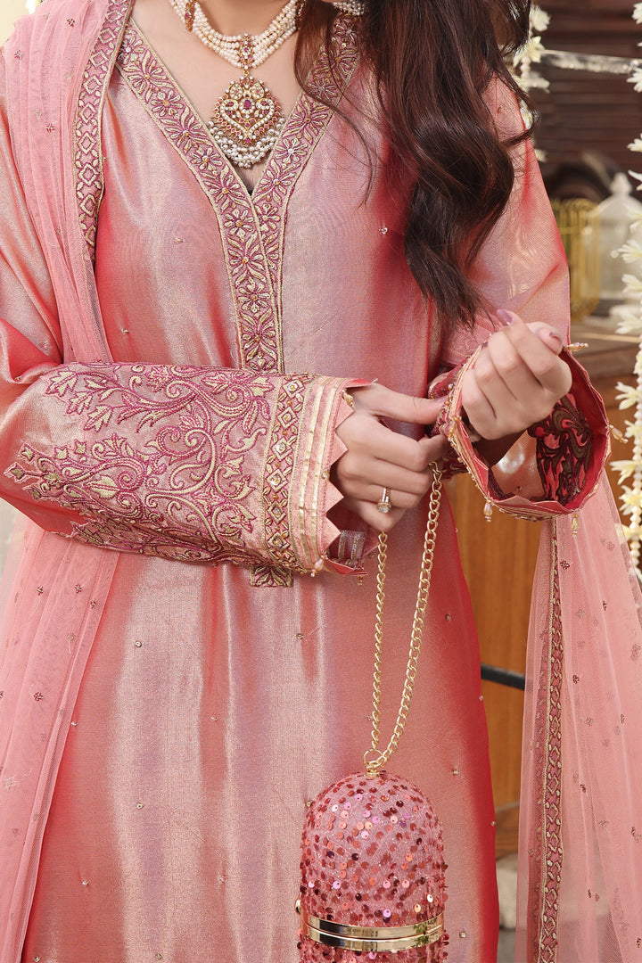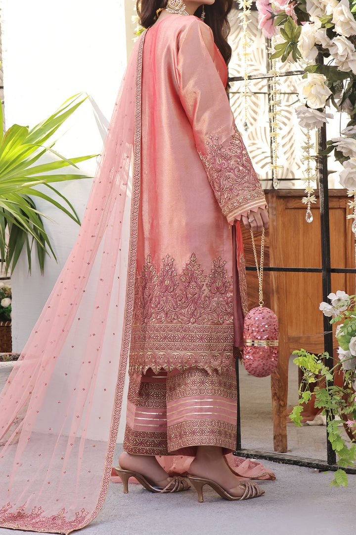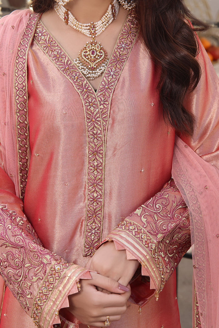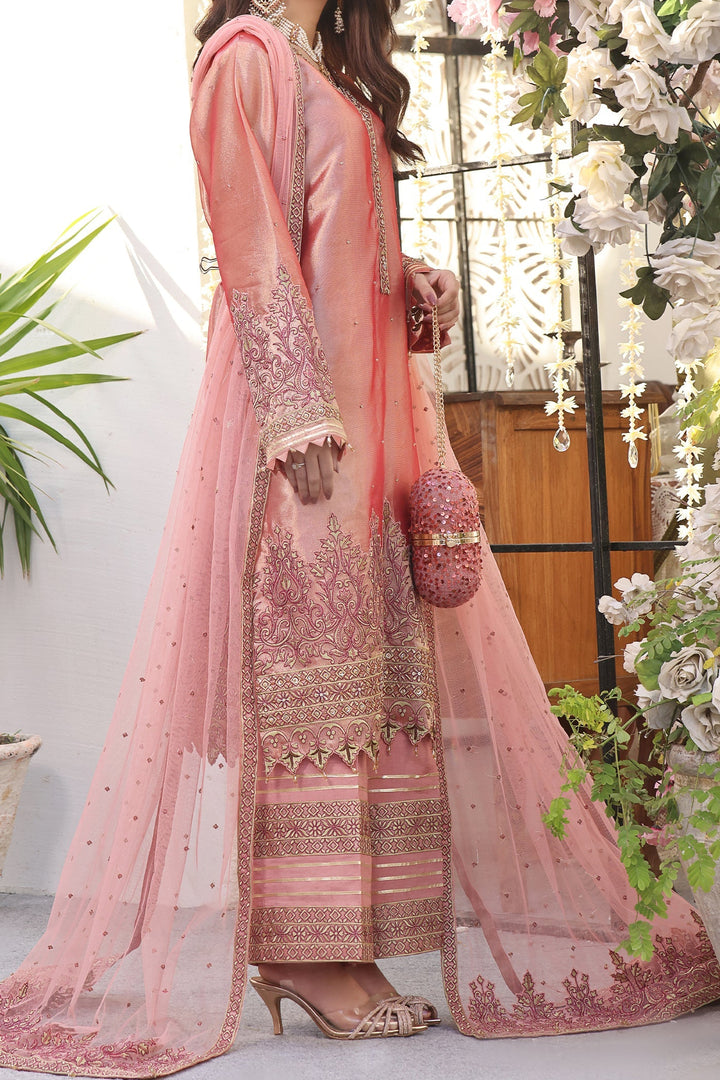This ethereal pink three-piece suit is adorned with a breathtaking array of traditional adda work, featuring the intricate artistry of resham threads, sequins, dabka, pearls, stones, and moti. Every stitch is a testament to impeccable craftsmanship. The dupatta is adorned with chann and moti on the borders, with a classic cut-work trouser to pair with, making it a perfect statement style for a festive occasion.