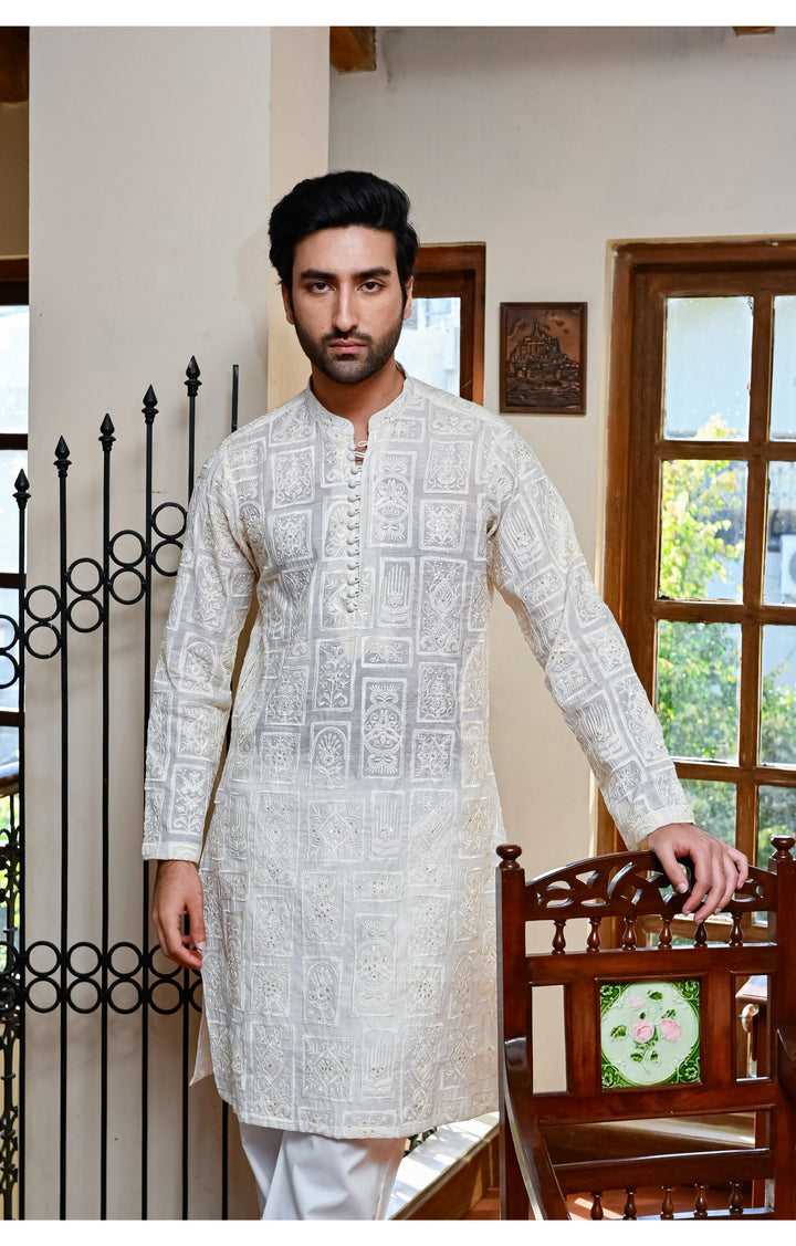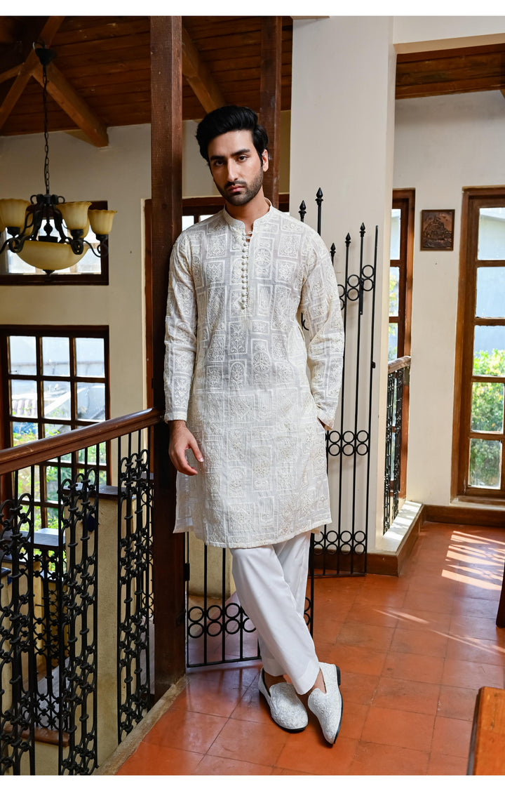 Elevate your wedding attire with this Elegant Off White Embroidered Kurta & Trouser Set. Crafted from luxurious raw silk fabric, the ensemble features intricate embroidery that exudes sophistication and charm, making it the perfect choice for a stylish and memorable celebration.