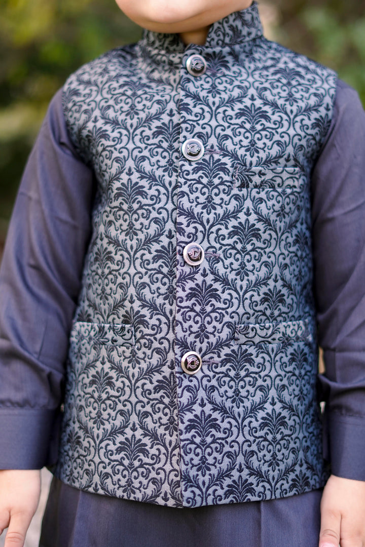 The black color adds a touch of sophistication, and the grey jamawar waistcoat elevates the overall look with its intricate detailing. The kurta pajama is a classic and versatile outfit that can be dressed up or down depending on the occasion. Whether you're attending a wedding or a festive celebration, this ensemble will surely make you stand out. Plus, the comfort of the wash and wear fabric ensures that you'll feel great while looking fashionable. Rock that grey kurta pajama with confidence!