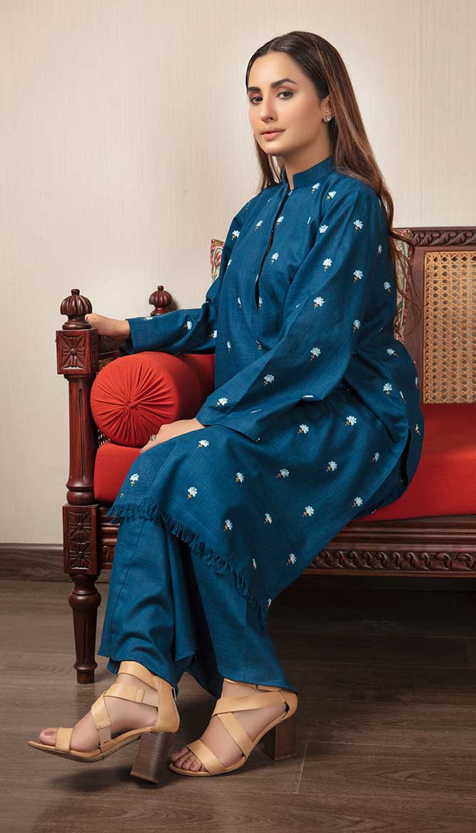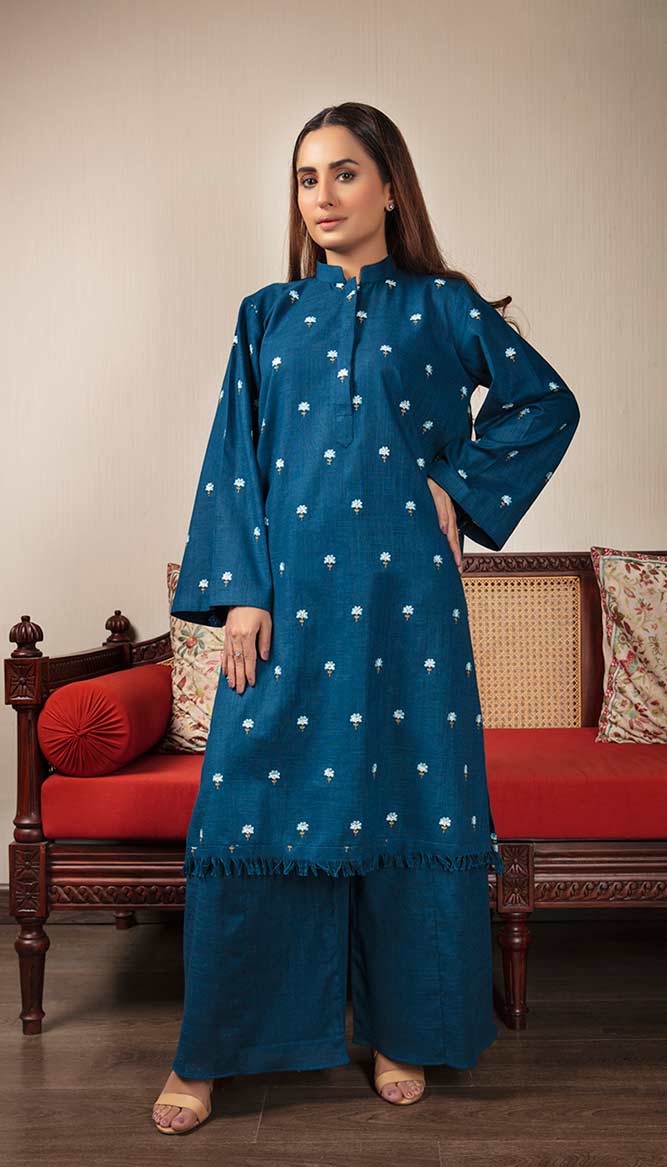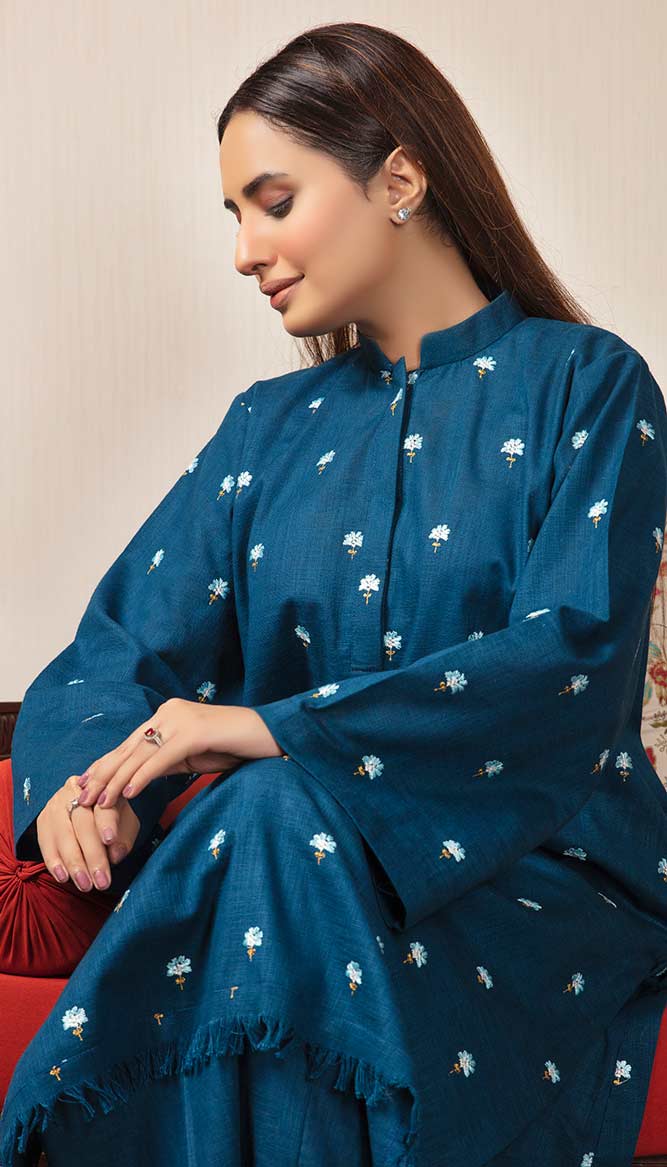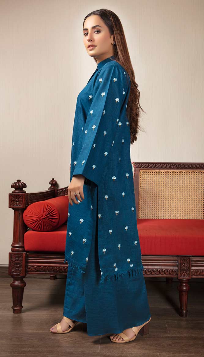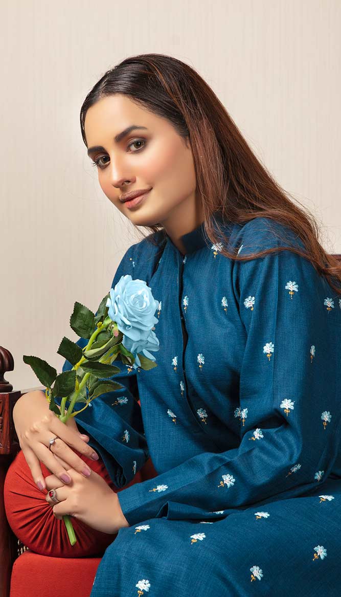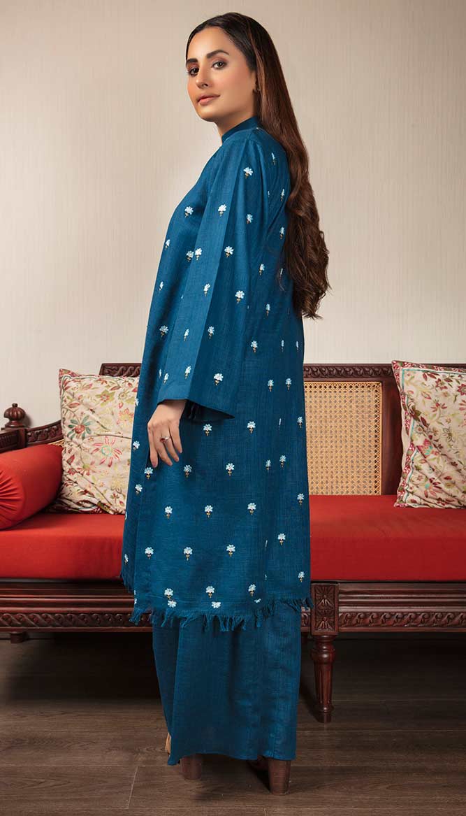 Relax with this blue khaddar suit. The delicate floral motifs provide a soothing, refreshing, and elegant effect. This suit is ideal for a modest yet modern look, as it seamlessly mixes style and comfort.