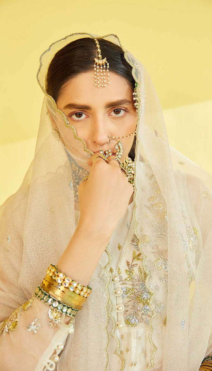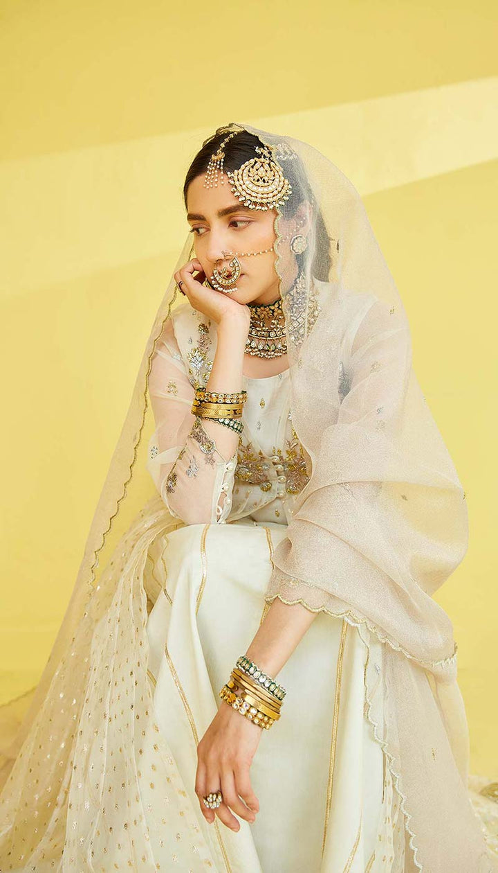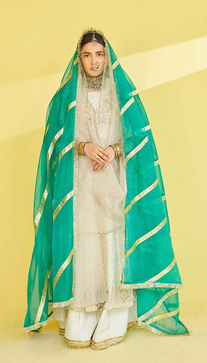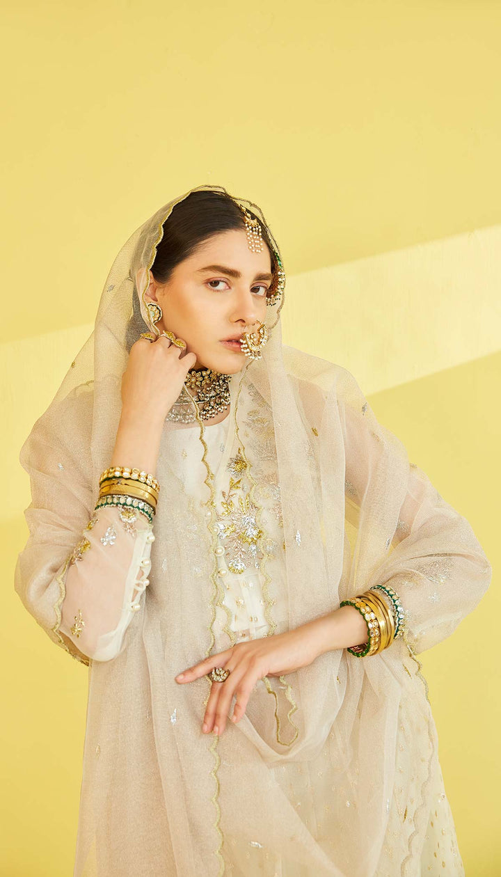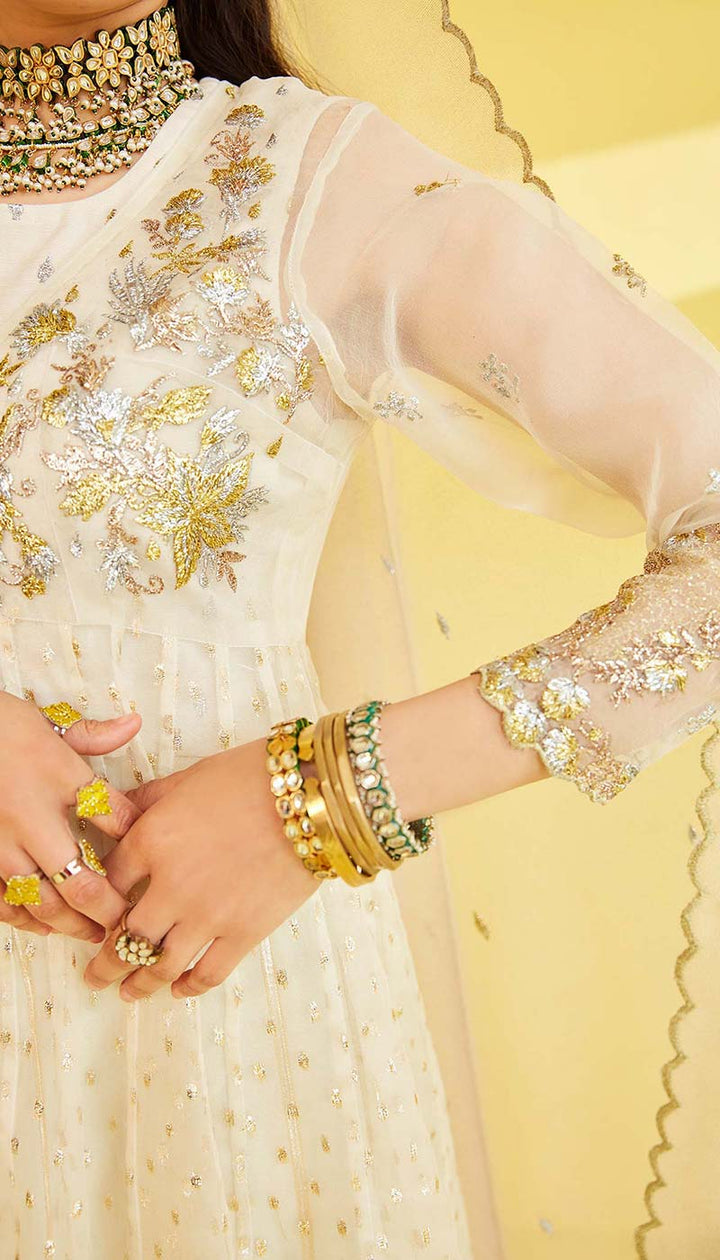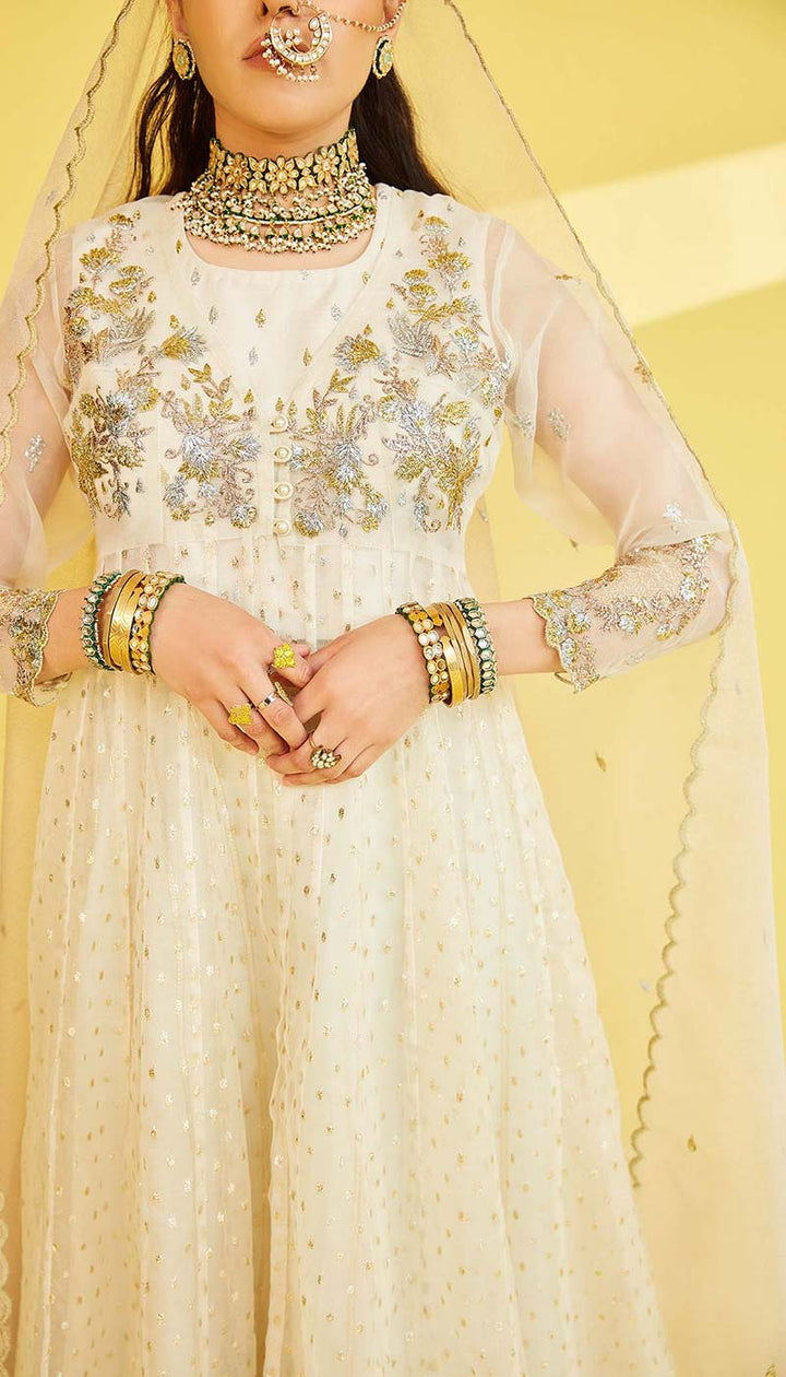 An ivory white front open pish was set based in Banarasi Organza with a bodice heavenly embroidered with gold silver and rose gold badla Mukesh with scalloped sleeves. A booti