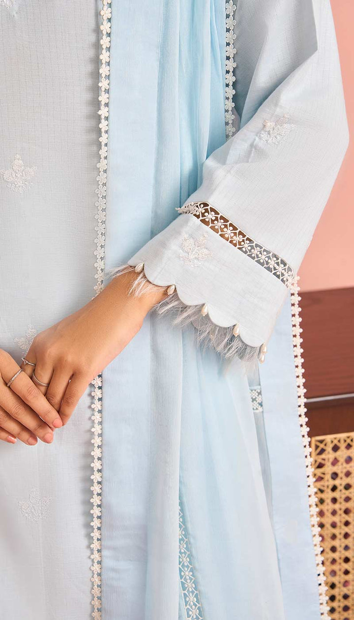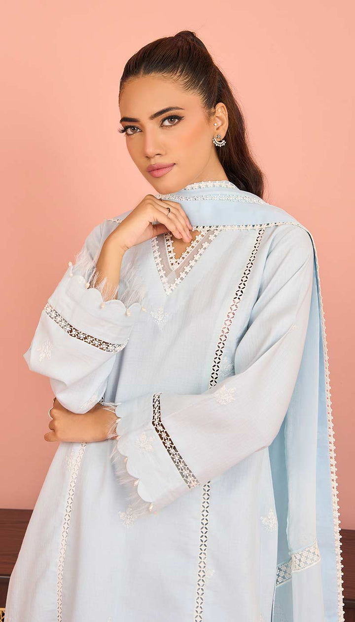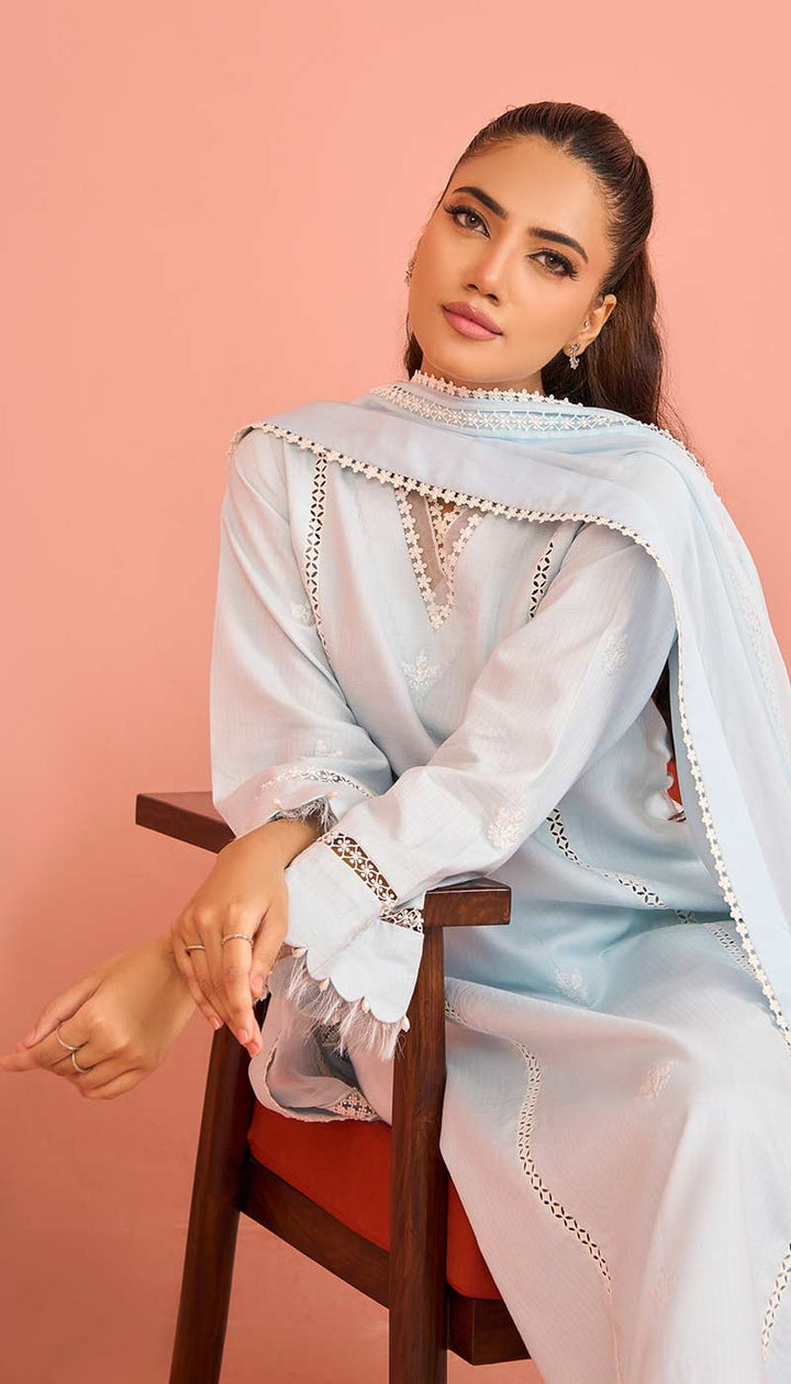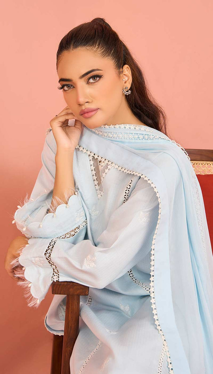 The intricate lace pattern on “Ruth” makes it visually appealing. The high-quality and breathable fabric ensures comfort all day long. The neckline, sleeves, and trousers are embellished with delicate lace. The borders of the dupatta have fine lace, that gives it a luxurious feel.