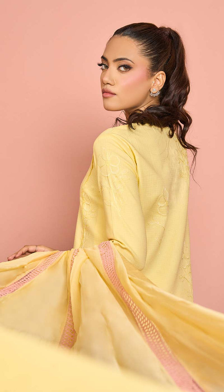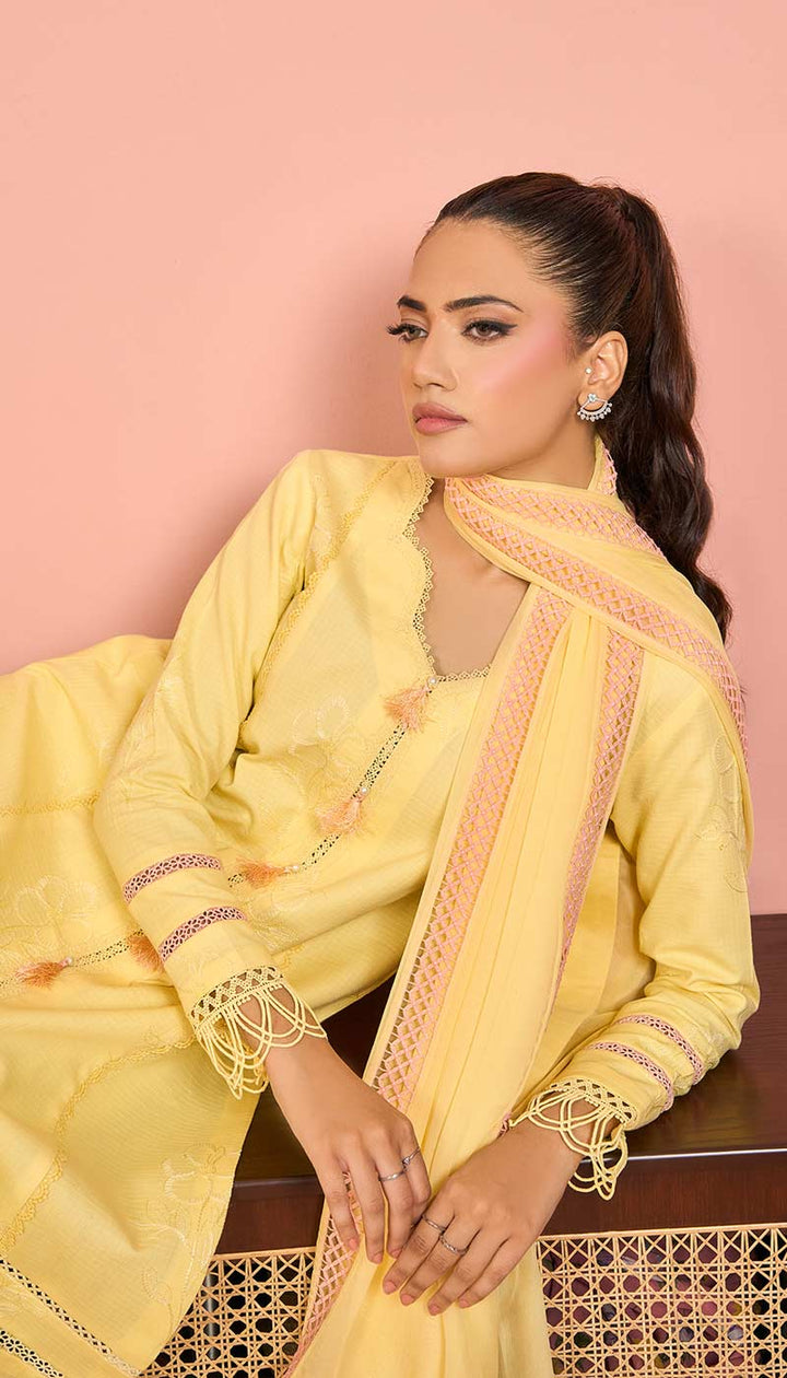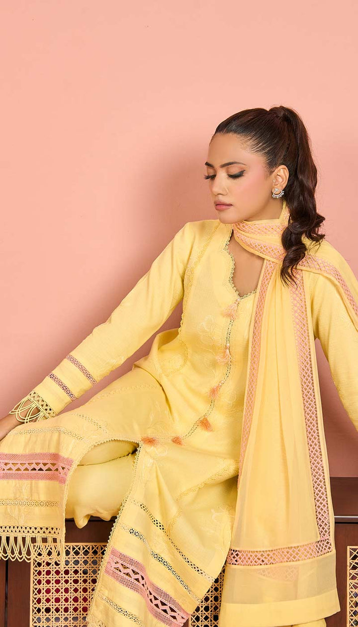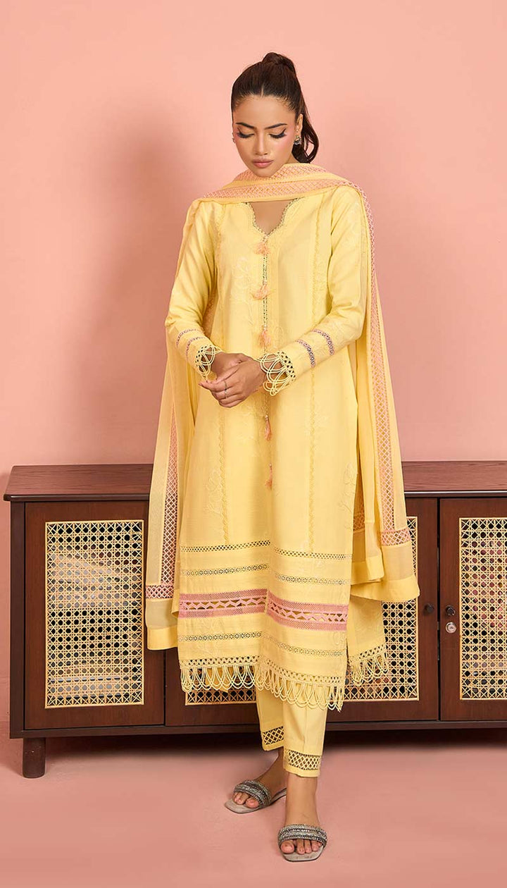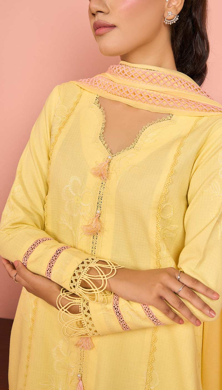 Step into elegance with our exquisite lawn suit, the delicate lace detailing adds a touch of sophistication. The neckline of the shirt has tassels on it. The front side of the shirt has lace detailing on it, the sleeves are also adorned with pink color lace.