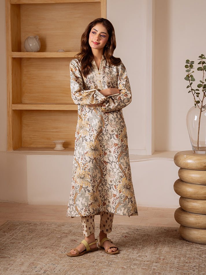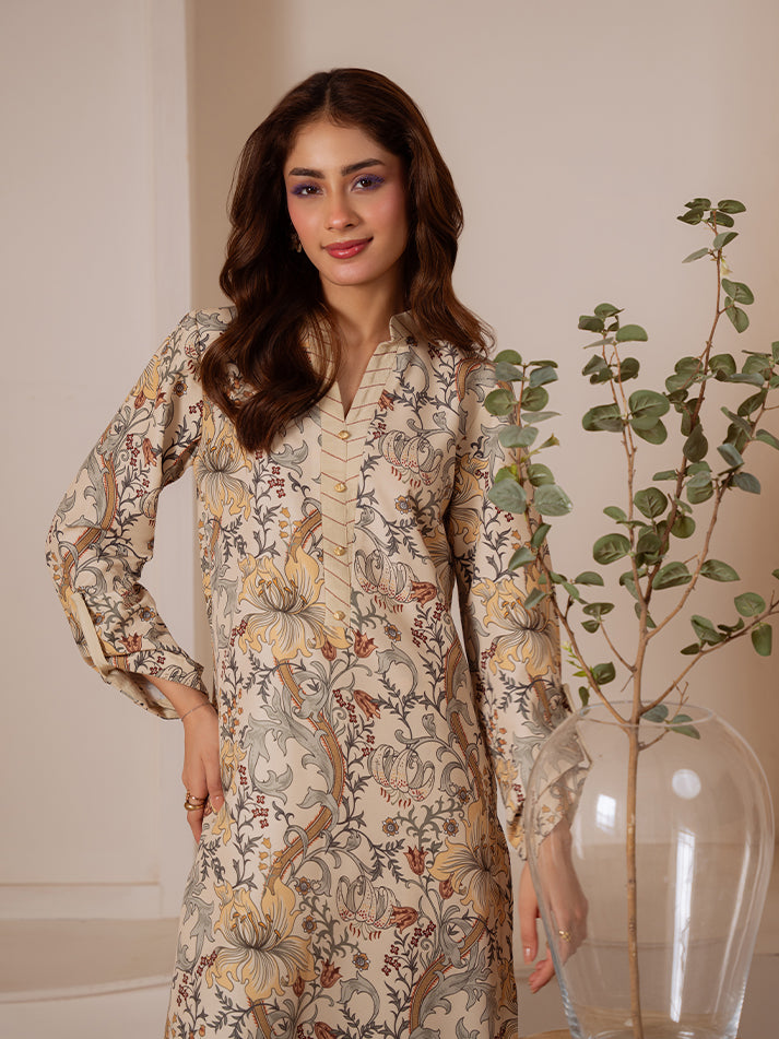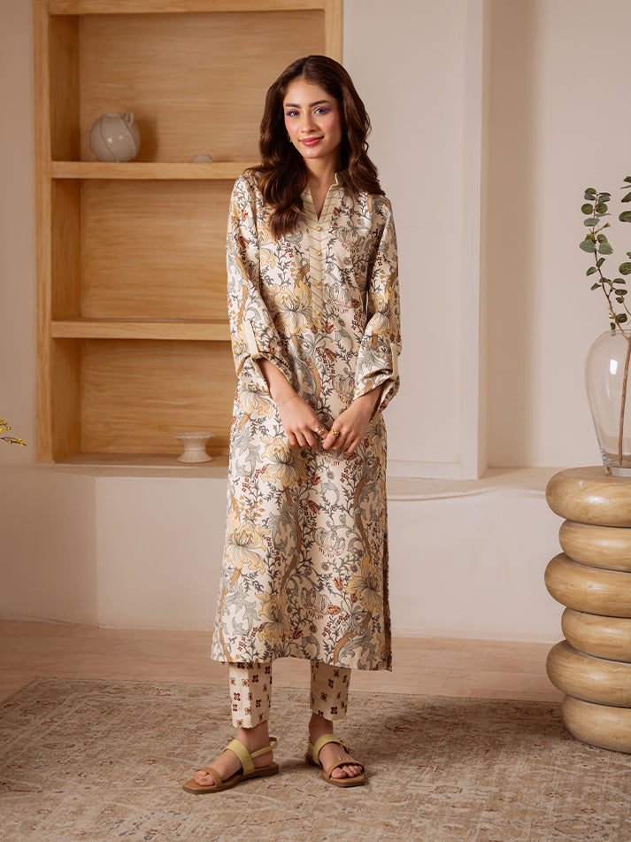 Sandalwood Bloom is a graceful two-piece set crafted in soft poly lawn on a soothing wood ash base, adorned with delicate florals in pale marigold, sage gray, and dusty terracotta. The gentle interplay of colors creates a refined yet refreshing look, making this ensemble a perfect choice for effortless everyday elegance.