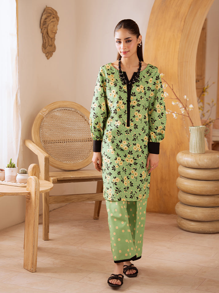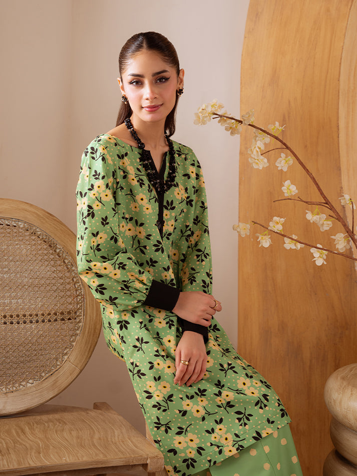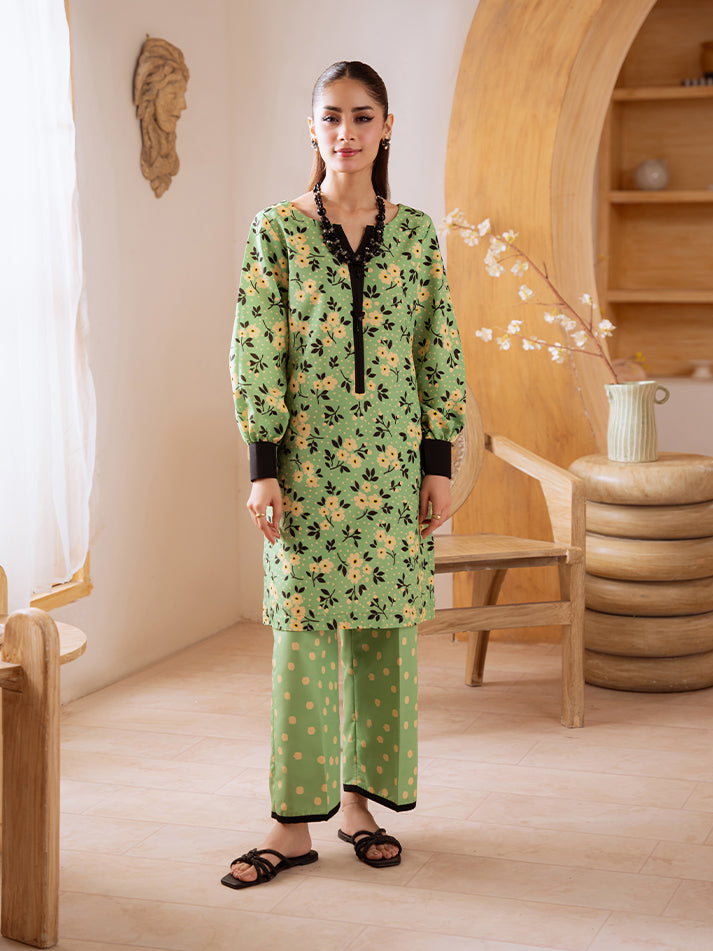 Savana brings a refreshing charm with its macaw green poly lawn base, adorned with a delicate beige and black floral pattern. The design is elevated with a striking black neckline and cuff-style black sleeves that add a touch of sophistication to the look. This two-piece set combines graceful detailing with modern appeal, making Savana an effortlessly stylish choice for everyday wear.